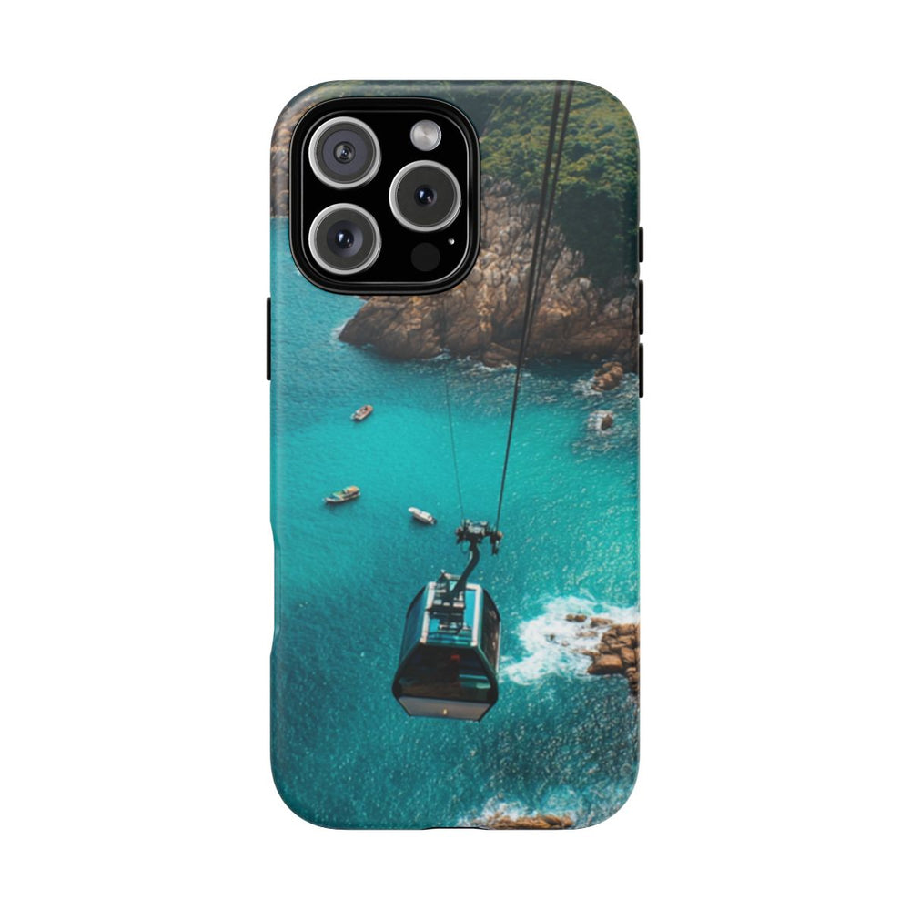 Dit hoesje toont een kabelbaan die boven een levendige turquoise zee zweeft, waar kleine bootjes op het water dobberen. Onder de kabelbaan liggen rotsachtige kliffen en groene begroeiing langs de kust, terwijl golven zachtjes tegen de rotsen slaan. De afbeelding straalt hoogte en natuurlijke schoonheid uit. Het matte, stevige hoesje is gemaakt van polycarbonaat en TPU, en biedt uitstekende bescherming en duurzaamheid, ook buitenshuis. Geschikt voor draadloos opladen.