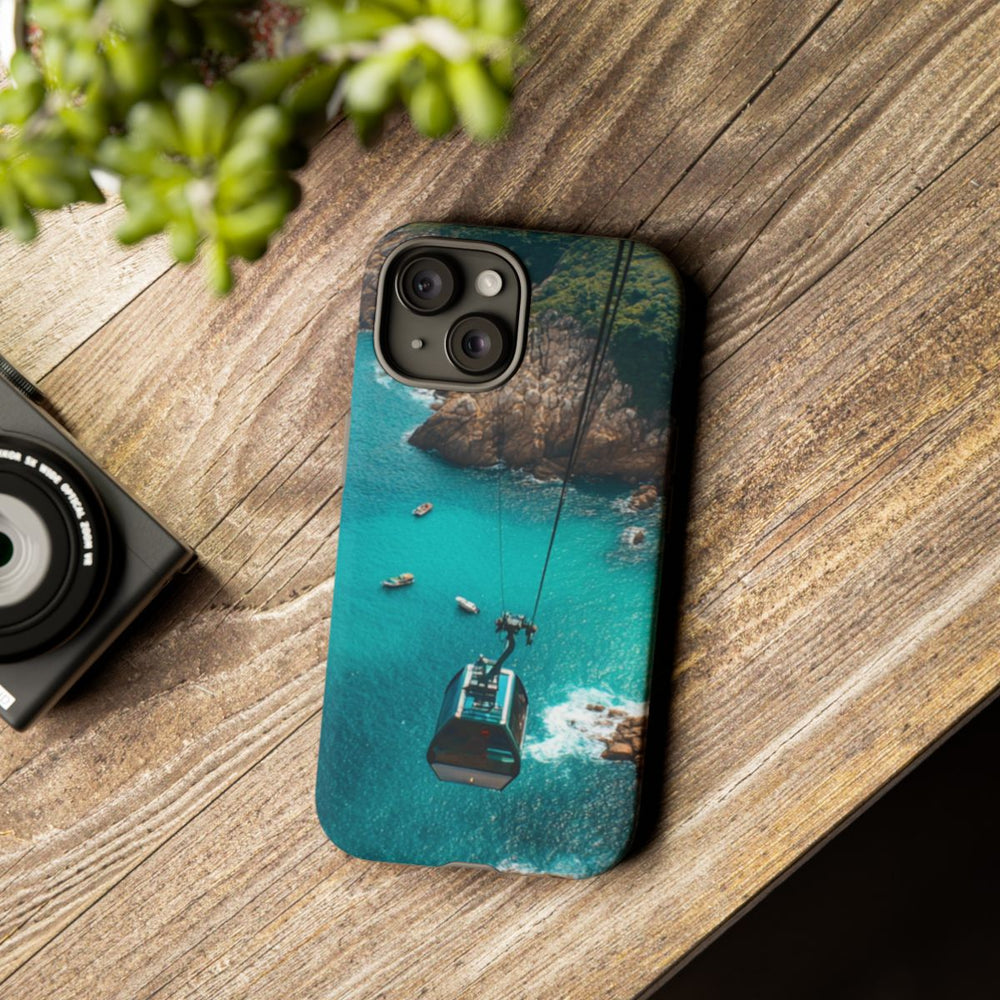 Dit telefoonhoesje toont een kabelbaan die hoog boven een levendige turquoise zee zweeft, omgeven door rotsachtige kliffen en groene heuvels langs de kust. Op het heldere water varen enkele kleine bootjes. Het ontwerp geeft een prachtig uitzicht over de kustlijn met natuurlijke kenmerken en helderblauw water. Het matte hoesje is gemaakt van polycarbonaat en TPU voor extra stevigheid en ondersteunt draadloos opladen.
