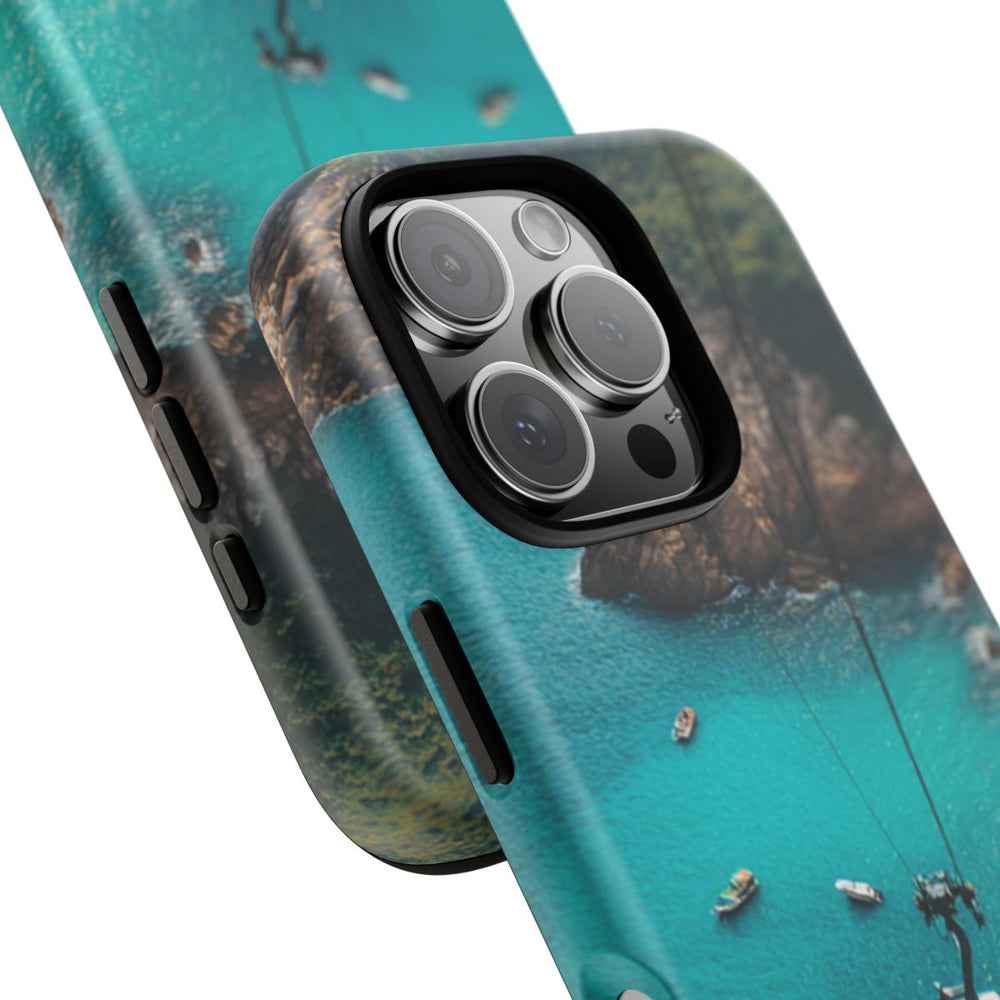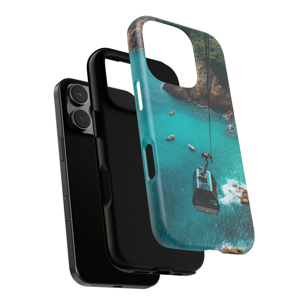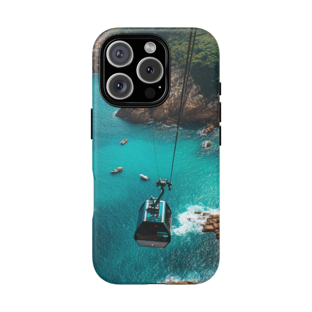 Dit telefoonhoesje toont een kabelbaan die zweeft boven een levendige turquoise zee, waar verspreid enkele kleine bootjes varen. De kustlijn bestaat uit rotsachtige kliffen en weelderig groene begroeiing. Vanuit een hoog perspectief kijk je langs de kabels van de kabelbaan naar beneden, waardoor het contrast tussen het diepe blauw en het turquoise water en de ruige kustlijn mooi zichtbaar wordt. Het hoesje heeft een dubbele laag met een polycarbonaat buitenkant en een TPU-binnenzijde en ondersteunt draadloos opladen.