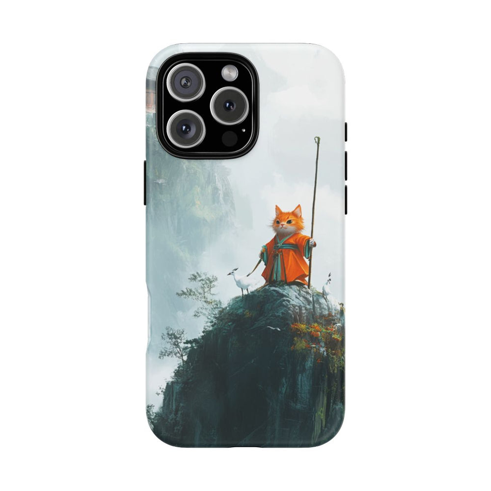 Op het hoesje staat een oranje kat in een traditioneel gewaad op een rotsachtige bergtop. De kat houdt een lange staf vast en wordt vergezeld door witte vogels. Op de achtergrond zijn mistige bergen, watervallen en een klassiek gebouw op een klif te zien. De scène straalt rust en mystiek uit, met veel groen en helder licht die de natuurlijke en vredige sfeer versterken. Het hoesje bestaat uit twee lagen: een stevige polycarbonaat buitenkant en een TPU-binnenzijde. Geschikt voor draadloos opladen.