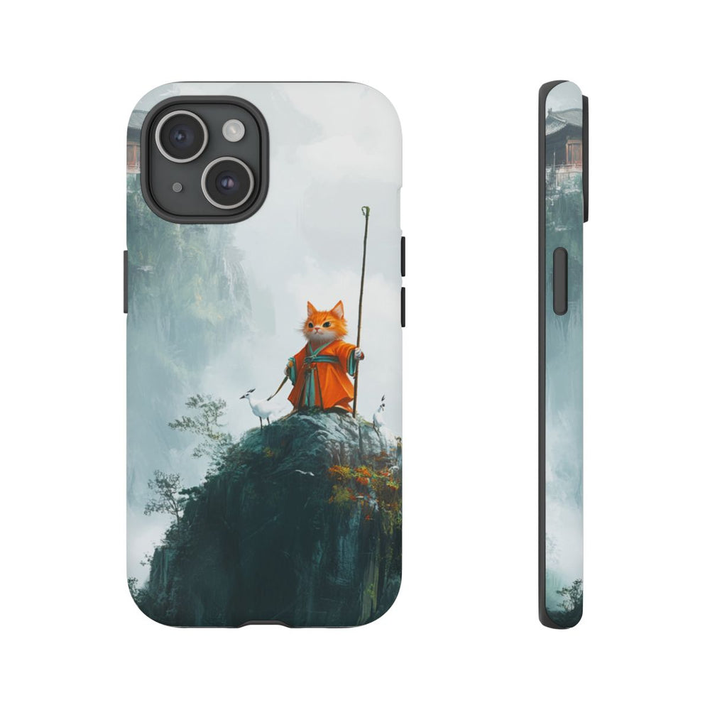 Dit telefoonhoesje toont een oranje kat in een traditionele geleerdenmantel, staand op een rotsachtige bergtop. De kat houdt een lange stok vast en wordt omringd door witte vogels. Op de achtergrond zijn mistige bergen, watervallen en een gebouw in klassieke stijl op een klif te zien. De illustratie heeft een zachte, dromerige uitstraling met een lichte en heldere sfeer. Het hoesje bestaat uit twee lagen: een stevige polycarbonaat buitenkant en een TPU-binnenzijde. Geschikt voor draadloos opladen.
