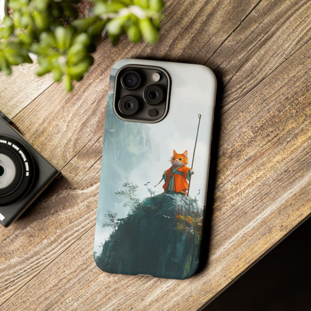 Dit telefoonhoesje toont een oranje kat gekleed in een traditioneel geleerdengewaad op een rotsachtige bergtop. De kat houdt een lange staf vast en wordt omringd door witte vogels. Op de achtergrond zijn mistige bergen, watervallen en een traditioneel gebouw op een klif te zien. De afbeelding is geschilderd in een zachte, mistige stijl met groene en grijze tinten. Het hoesje bestaat uit twee lagen van polycarbonaat en TPU voor optimale bescherming en is geschikt voor draadloos opladen.