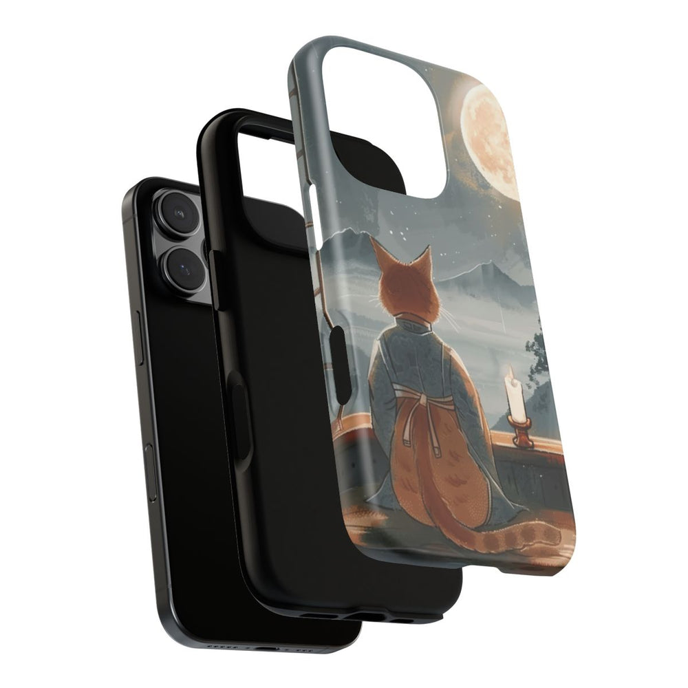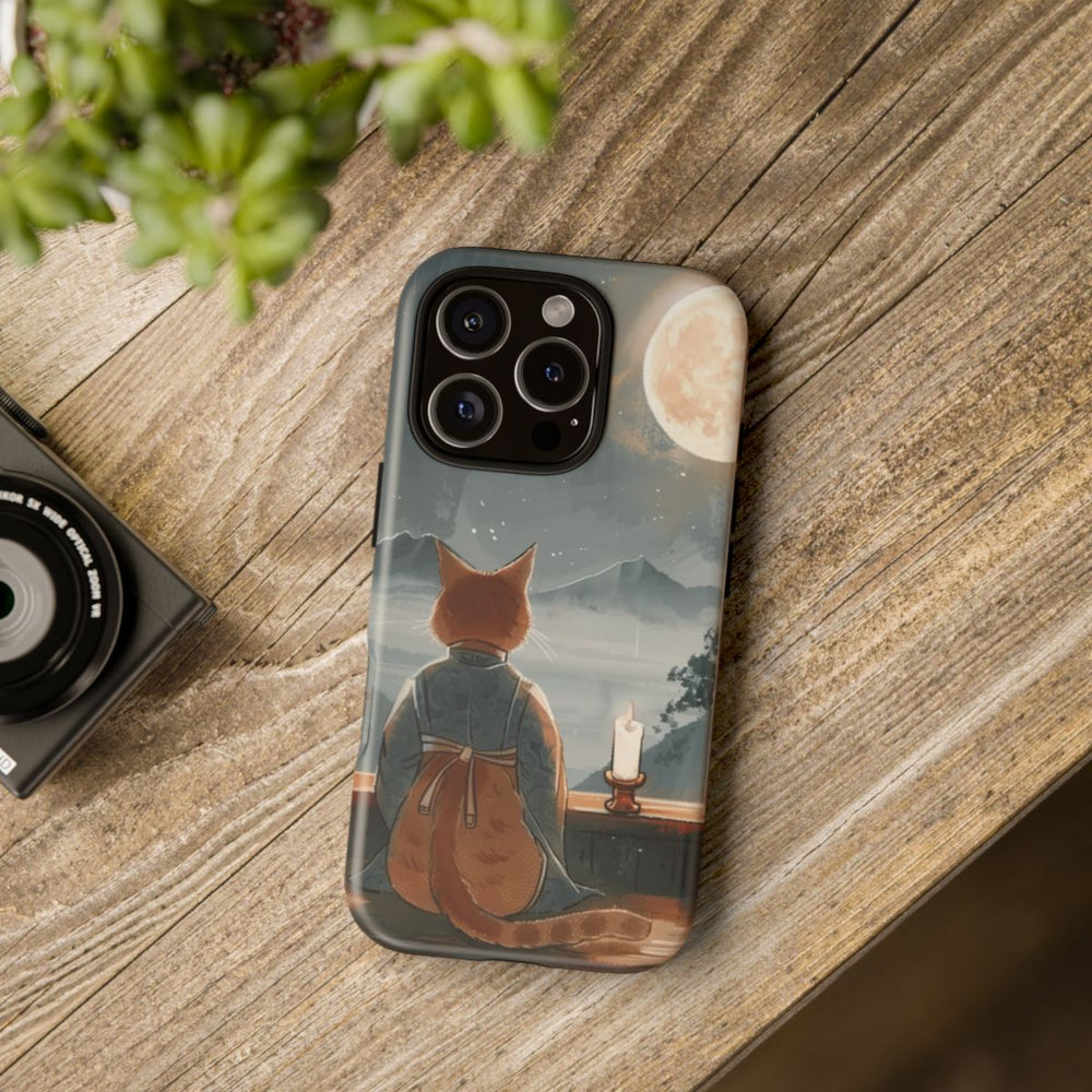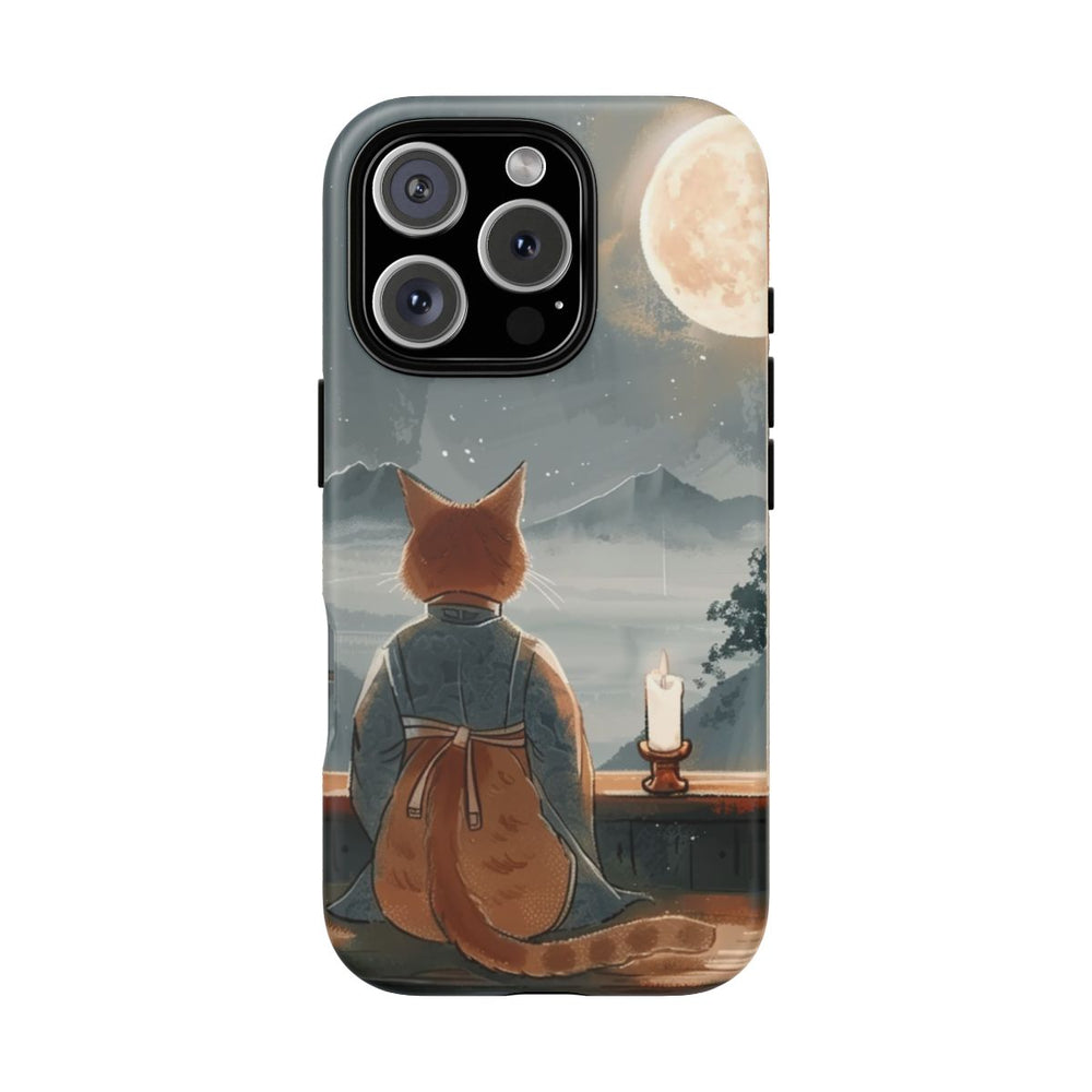 Dit hoesje toont een oranje kat in een traditioneel gewaad, zittend op een houten oppervlak en uitkijkend door een groot raam. Buiten straalt een heldere volle maan aan een onbewolkte nachtelijke hemel vol sterren. Op de vensterbank staat een brandende kaars die een warme gloed verspreidt. Op de achtergrond zijn mistige bergen en bomen te zien, wat zorgt voor een rustige en contemplatieve sfeer. Het hoesje bestaat uit twee lagen met een matte afwerking: een stevige polycarbonaat buitenkant en een TPU-binnenzijde. Ondersteunt draadloos opladen.