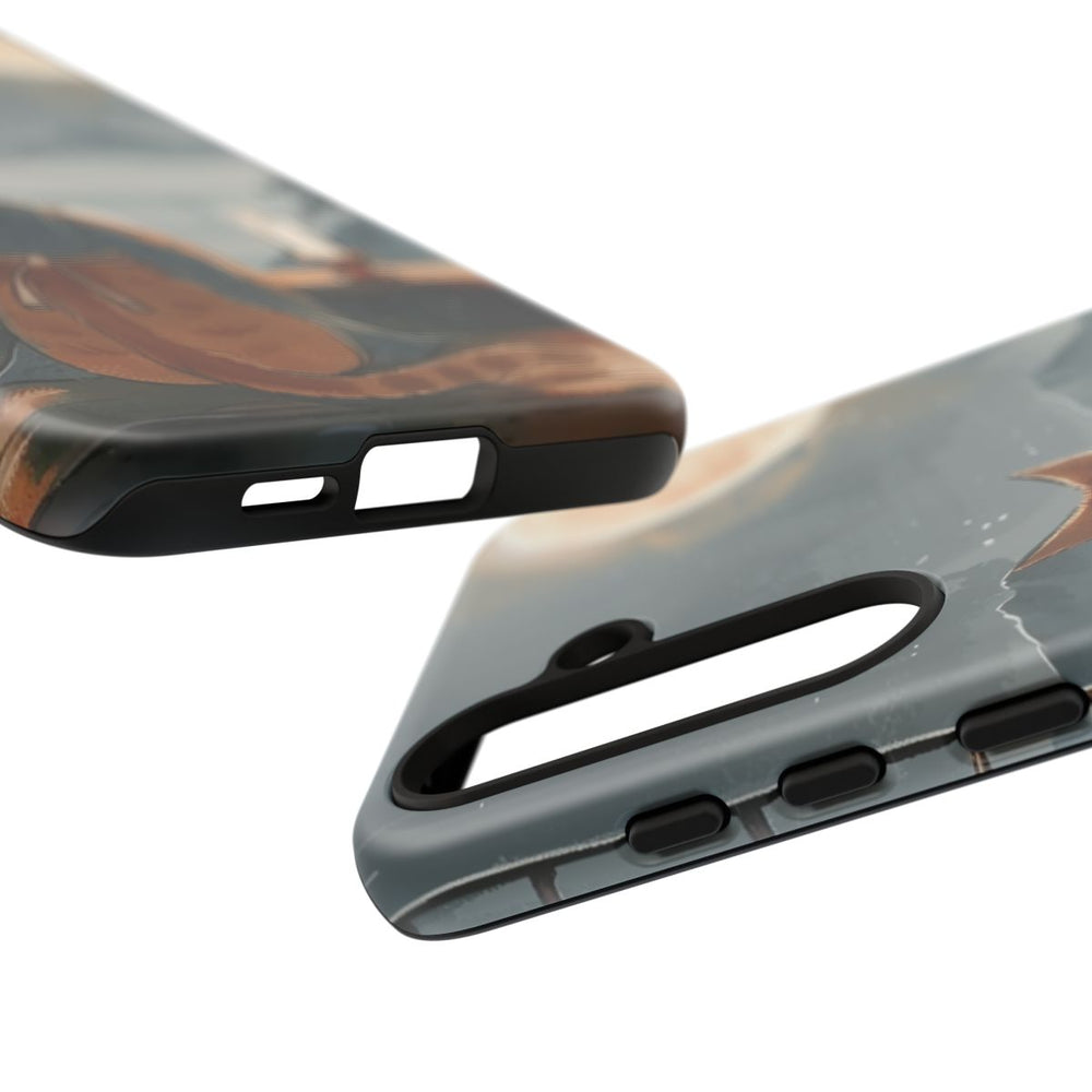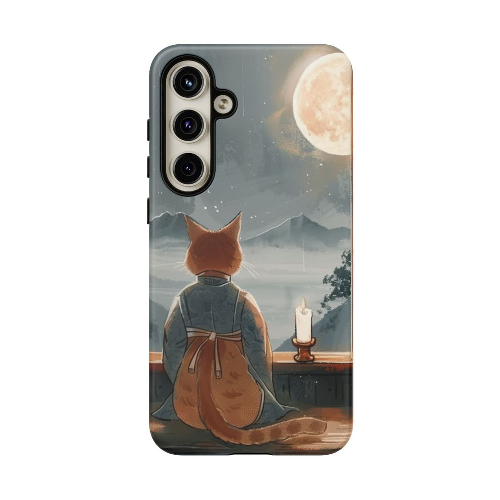 Dit hoesje toont een oranje kat in een traditioneel gewaad, zittend op een houten bank bij een groot raam. De kat kijkt uit naar een heldere volle maan aan een sterrenhemel. Op de vensterbank staat een brandende kaars die een warme gloed verspreidt. Buiten zijn mistige bergen en bomen zichtbaar in het maanlicht. Het hoesje heeft een dubbele laag van polycarbonaat en TPU met een matte afwerking en ondersteunt draadloos opladen.
