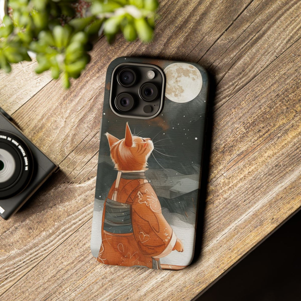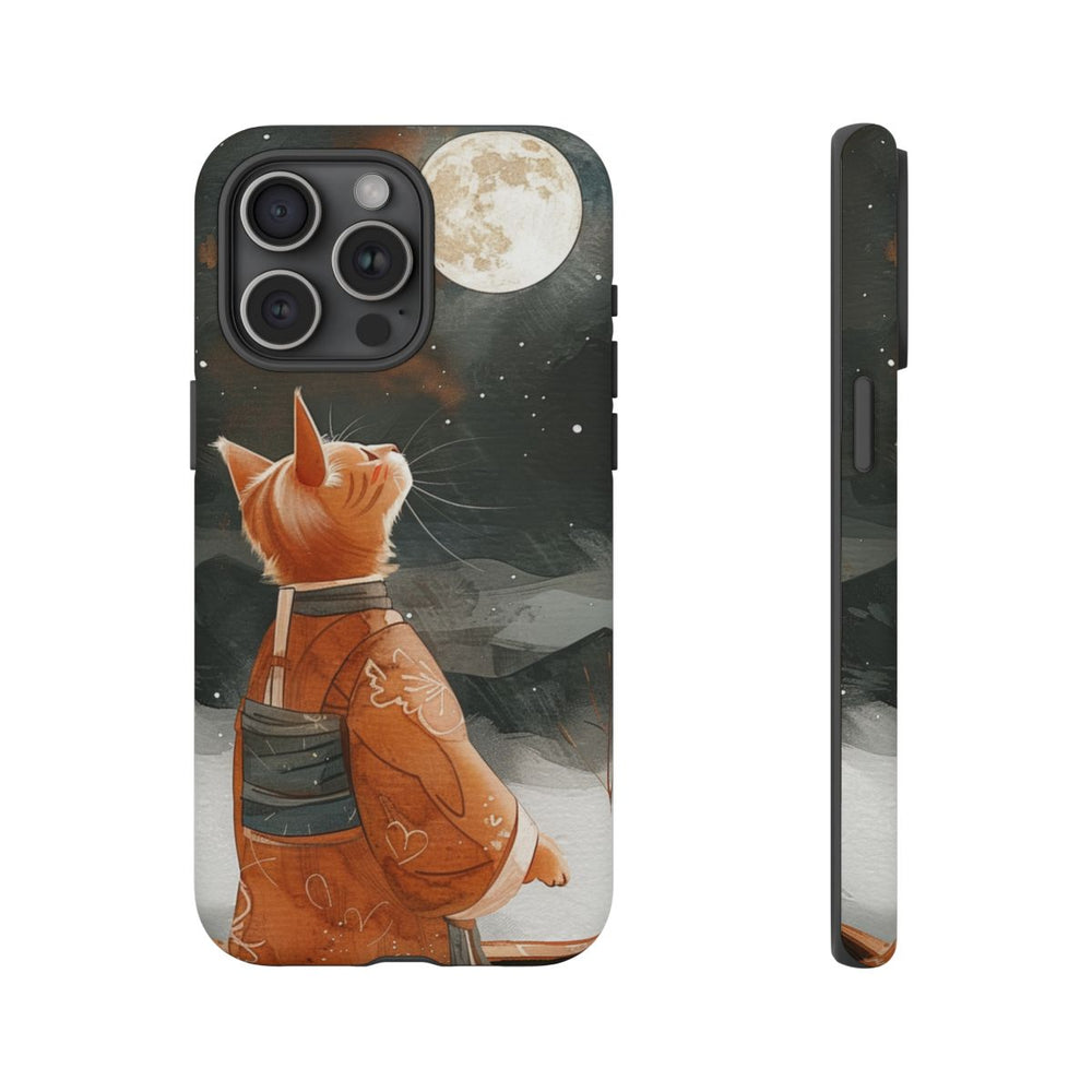Dit hoesje toont een oranje kat in een traditioneel gewaad, die binnen staat en omhoog kijkt naar een heldere volle maan aan een donkere sterrenhemel. Op de achtergrond zijn verre bergen en kale bomen te zien, wat zorgt voor een rustige en vredige sfeer. Het hoesje heeft een stevige dubbele laag van polycarbonaat en TPU, ondersteunt draadloos opladen en biedt uitstekende bescherming.