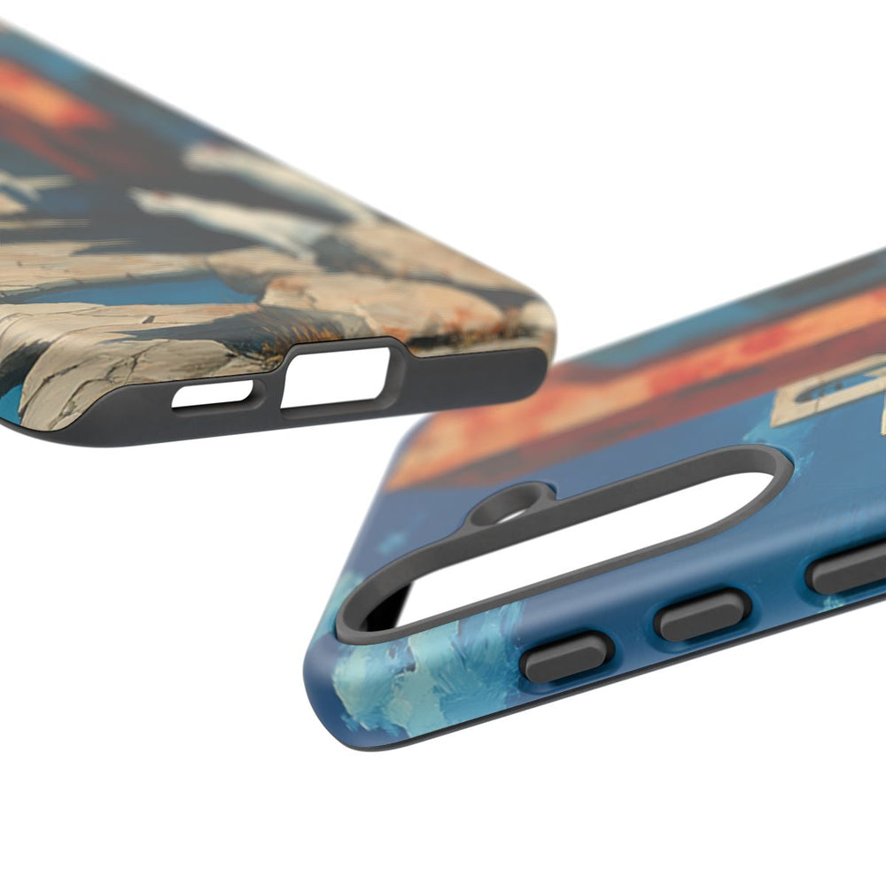 Dit ontwerp toont twee witte katten die op rotsen zitten in een surrealistisch landschap. Op de achtergrond zijn abstracte gebouwen te zien in rode en witte tinten onder een heldere blauwe lucht. De scène straalt een dromerige sfeer uit, geïnspireerd op klassieke kunststijlen. Het telefoonhoesje is gemaakt van 100% polycarbonaat met een voering van 100% TPU, wat zorgt voor een dubbele laag voor extra stevigheid en bescherming. Het hoesje ondersteunt draadloos opladen en is daardoor een praktische keuze voor dagelijks gebruik.