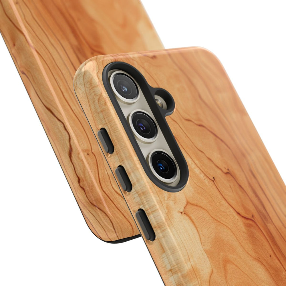 Dit telefoonhoesje heeft een gedetailleerde kersenhouten nerfstructuur met natuurlijke, golvende lijnen en knoesten in warme bruintinten. Het patroon benadrukt het organische en gladde houtoppervlak, met subtiele kleur- en textuurverschillen. Het hoesje heeft een glanzende afwerking en is extra stevig dankzij de dubbele laag van een polycarbonaat buitenkant en een TPU binnenzijde. Het biedt optimale bescherming, ondersteunt draadloos opladen en is bestand tegen weersinvloeden, terwijl de helderheid behouden blijft.