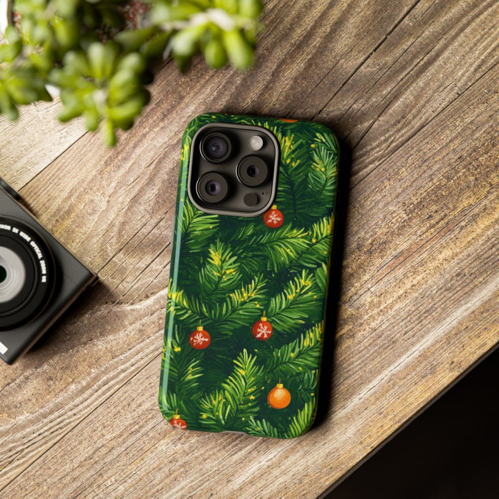 Dit ontwerp toont een dicht patroon van groene dennentakken met gele accenten, wat zorgt voor een rijke en feestelijke uitstraling. Tussen de takken zijn kleine rode en oranje kerstballen verspreid, waarvan sommige zijn versierd met witte sneeuwvlokmotieven. De afbeelding is levendig en gedetailleerd, met veel aandacht voor de natuurlijke structuur van de dennentakken. Het hoesje heeft een glanzende afwerking en bestaat uit een stevige polycarbonaat buitenkant en een TPU binnenlaag, voor optimale bescherming. Ondersteunt draadloos opladen.