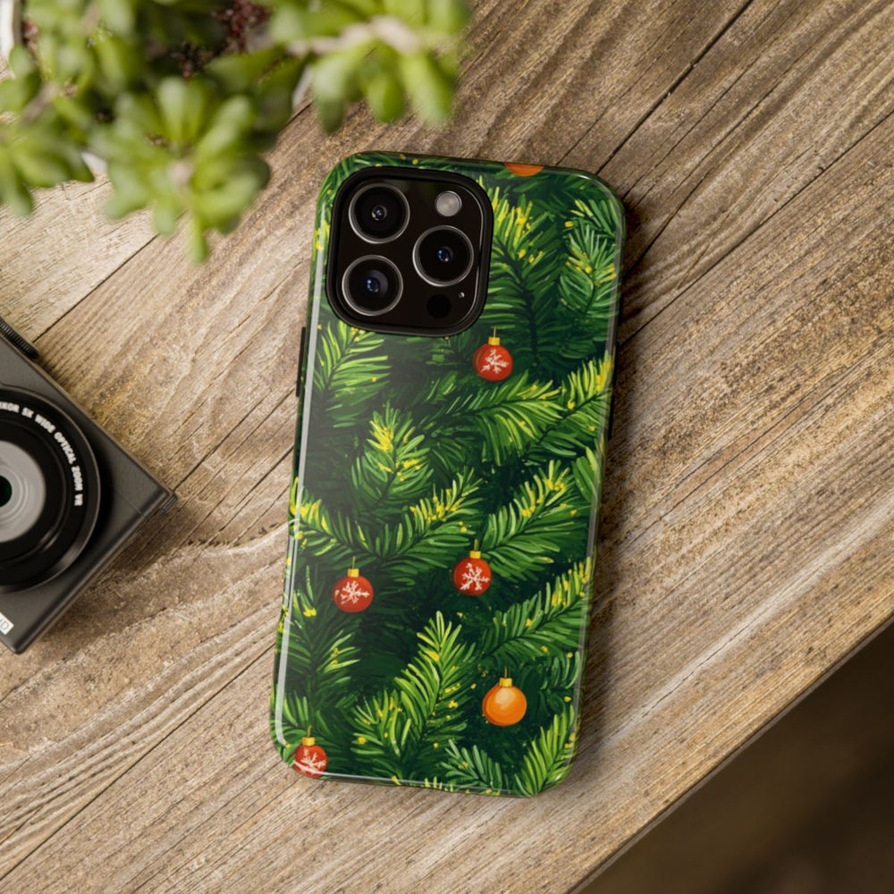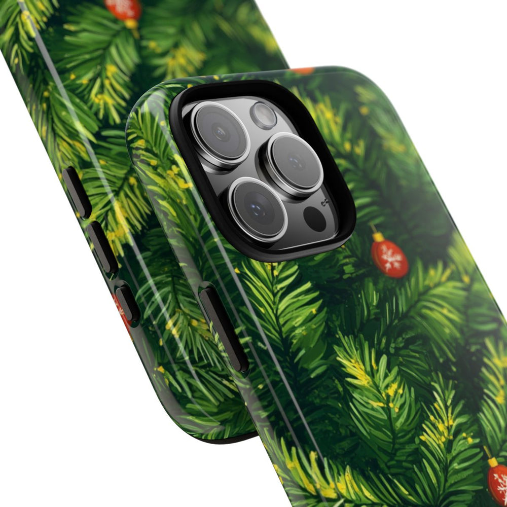 Dit ontwerp toont een dicht patroon van groene dennentakken met gele accenten, wat zorgt voor een rijke en feestelijke uitstraling. Tussen de takken zijn kleine rode en oranje kerstballen verspreid, waarvan sommige zijn versierd met witte sneeuwvlokmotieven. De afbeelding is levendig en gedetailleerd, met veel aandacht voor de natuurlijke structuur van de dennentakken. Het hoesje heeft een glanzende afwerking en bestaat uit een stevige polycarbonaat buitenkant en een TPU binnenlaag, voor optimale bescherming. Ondersteunt draadloos opladen.