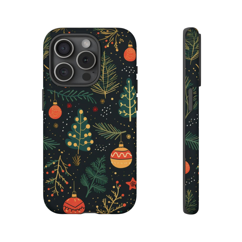 Dit hoesje heeft een feestelijk kerstpatroon met verschillende dennentakken, groene bladeren en versierde ornamenten in rood, oranje en geel. De zwarte achtergrond zorgt voor een opvallend contrast waardoor de kleurrijke details extra goed uitkomen. Kleine stippen en stervormen zijn verspreid over het ontwerp en geven het geheel een speelse uitstraling. Het patroon is gedrukt op een mat, stevig hoesje met een polycarbonaat buitenkant en TPU-binnenzijde. Dit biedt optimale bescherming en is geschikt voor draadloos opladen.
