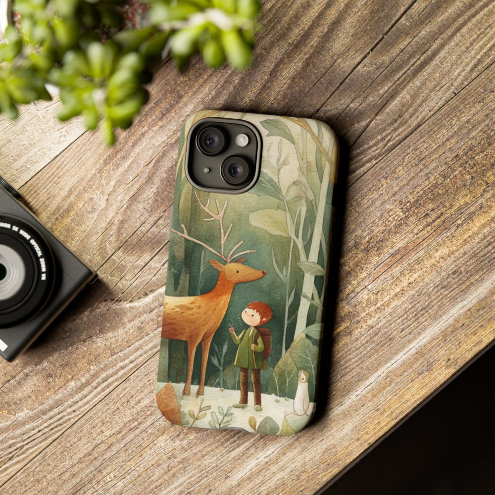 Dit hoesje is voorzien van een aquarelillustratie van een kind dat in een bos staat en oog in oog staat met een groot hert met gewei. Het kind draagt een groene jas en heeft een rugzak om, terwijl een klein wit vogeltje in de buurt zit. De achtergrond bestaat uit hoge bomen en grote bladeren in verschillende tinten groen en bruin, wat zorgt voor een warme, natuurlijke bosuitstraling. Het hoesje heeft een dubbele laag voor extra bescherming en is geschikt voor draadloos opladen.