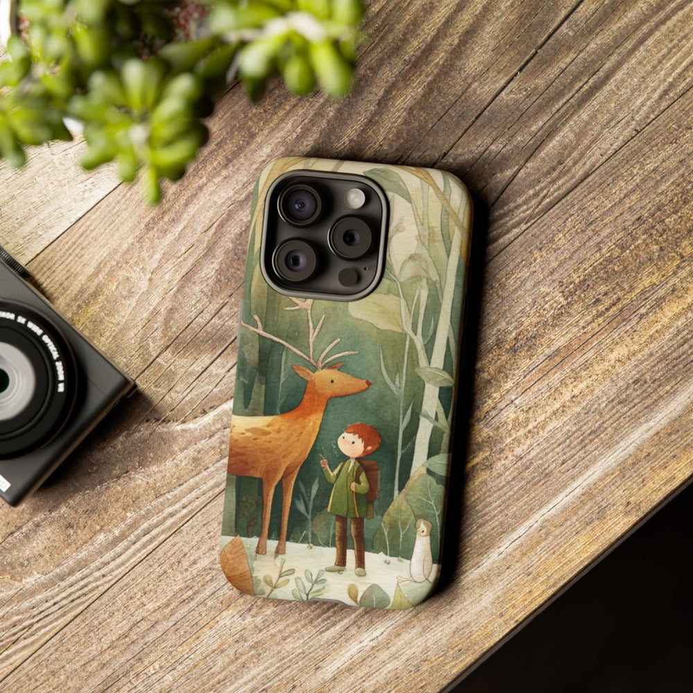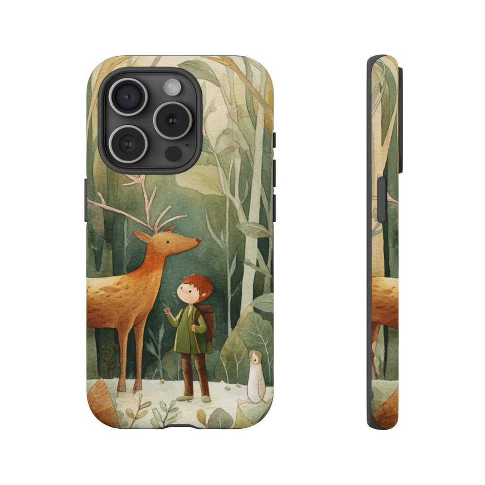 Dit telefoonhoesje is versierd met een sfeervolle aquarelillustratie van een kind dat naast een hert in een dicht bos staat. Hoge bomen met slanke stammen en grote groene en bruine bladeren omringen de hoofdpersonen. Het kind draagt een groene jas en heeft een rugzak om, terwijl een klein wit vogeltje in de buurt zit. Op de achtergrond valt zacht zonlicht tussen de bomen door, wat zorgt voor een warme en rustige sfeer. Het hoesje heeft een stevige polycarbonaat buitenkant en een TPU binnenzijde voor optimale dubbele bescherming en is geschikt voor draadloos opladen.
