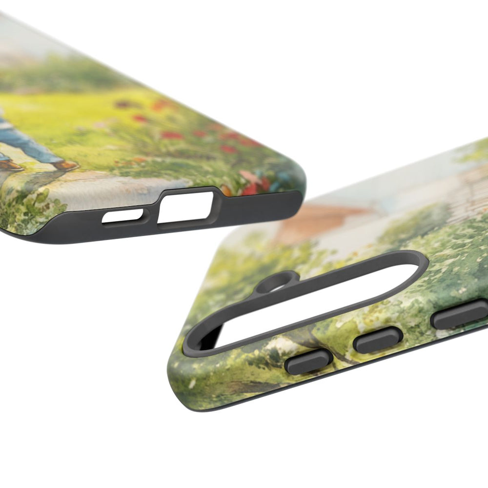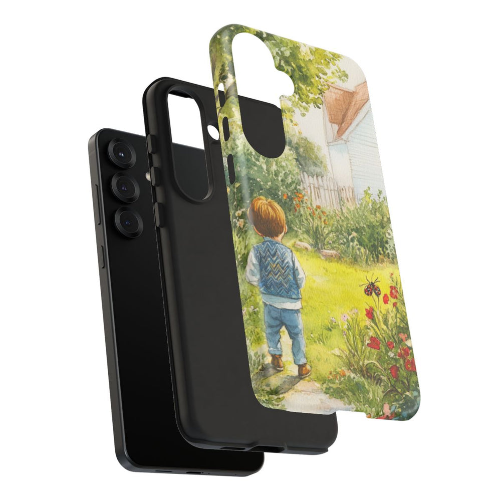 Deze illustratie toont een jong kind in een levendige tuin vol kleurrijke bloemen. Het kind draagt een vest met patroon en is van achteren te zien terwijl het naar een sfeervol huis op de achtergrond kijkt. De tuin is weelderig begroeid en staat volop in bloei, wat zorgt voor een vrolijke lentesfeer. Het ontwerp is gedrukt op een stevig mat telefoonhoesje dat optimale bescherming biedt voor je toestel. Ideaal voor liefhebbers van de natuur en speelse kunst.