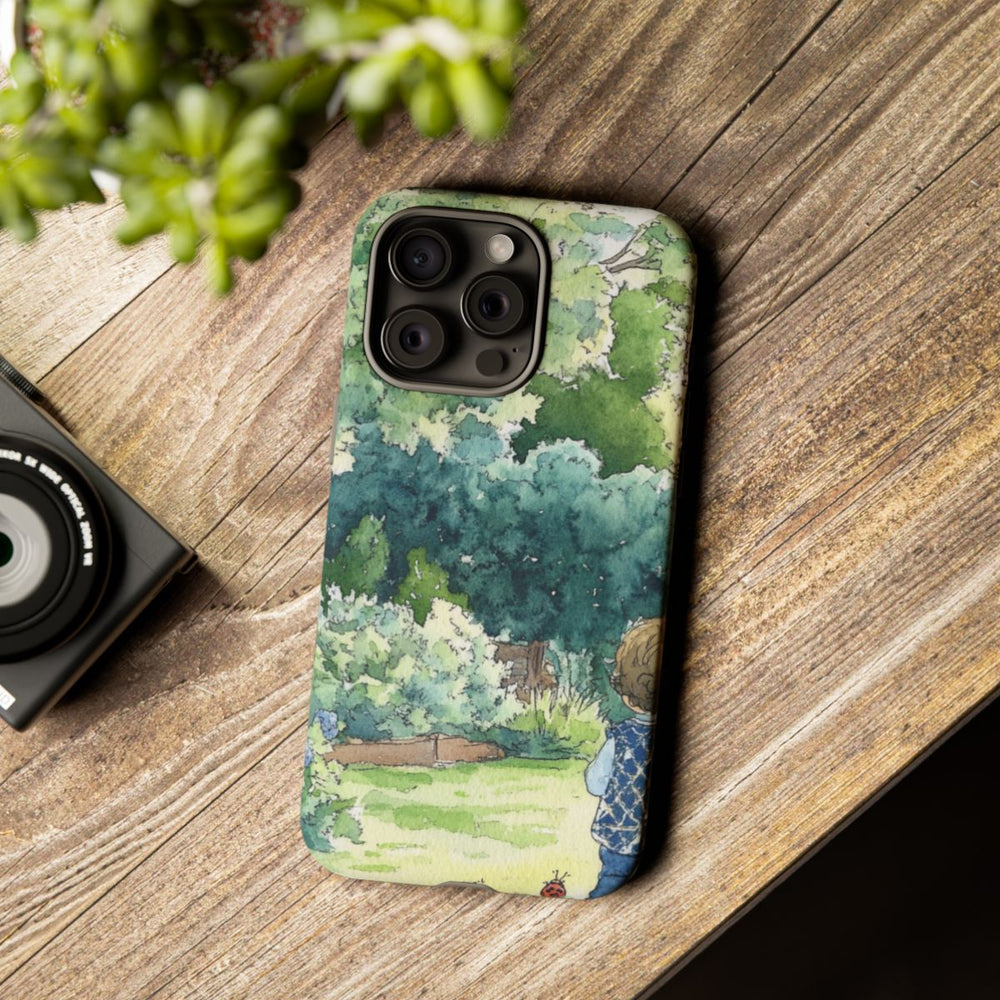 Deze illustratie toont een kind dat in een weelderige tuin staat, omringd door hoge bomen en levendig groen. Het kind draagt een stijlvolle blauwe bodywarmer en kijkt uit over het landschap. Op de grond is een schattig lieveheersbeestje te zien. Het kunstwerk ademt een rustige lentesfeer met zachte kleuren en gedetailleerd bladerdek, wat zorgt voor een charmant ontwerp voor een telefoonhoesje. Het hoesje bestaat uit twee lagen, is gemaakt van stevige materialen en ondersteunt draadloos opladen.