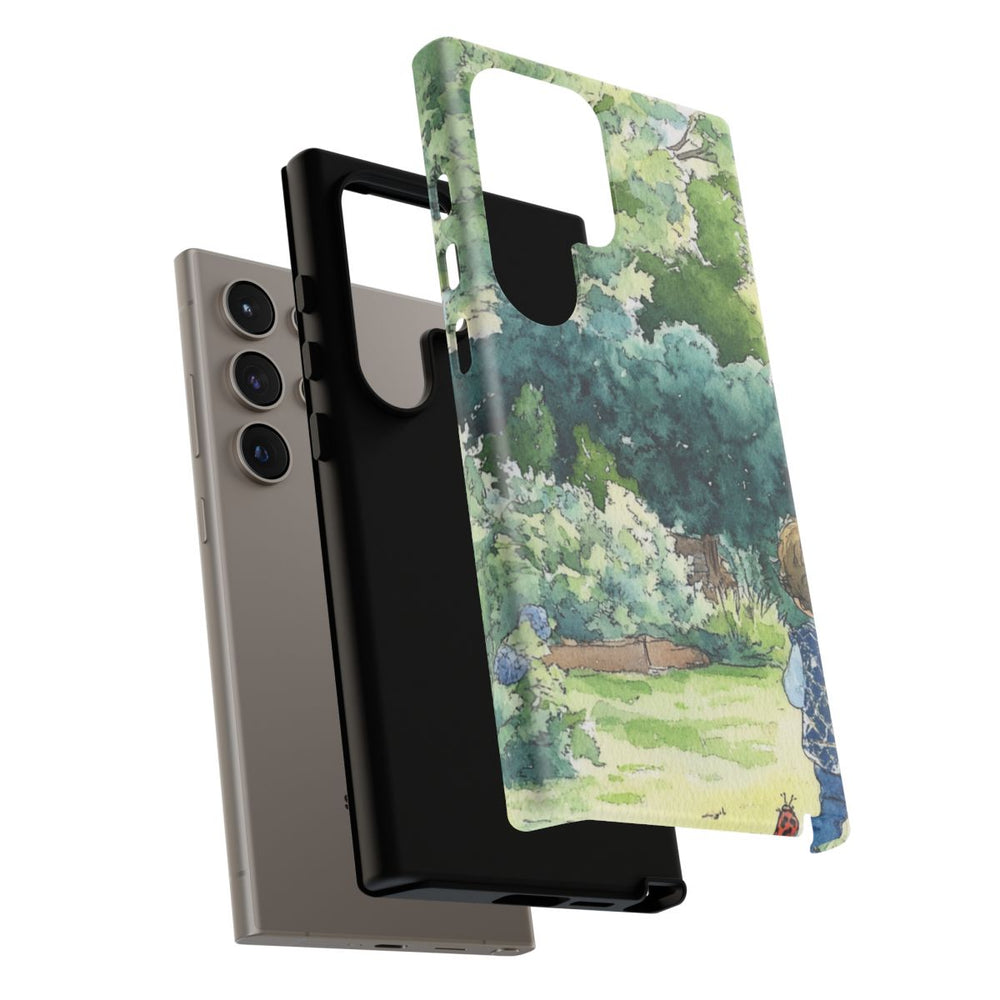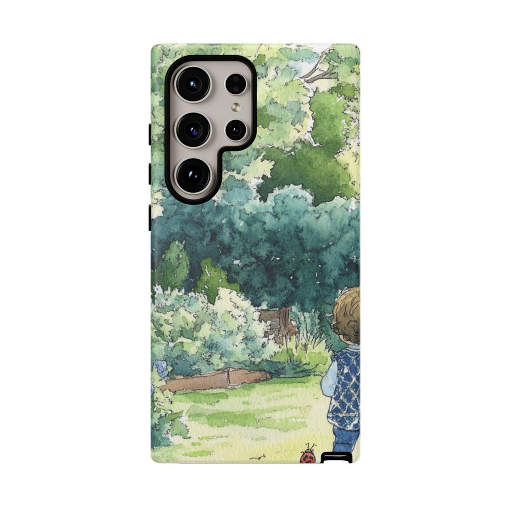 Dit hoesje heeft een sfeervolle aquarelillustratie van een kind in een weelderige tuin. Het kind is van achteren te zien, gekleed in een stijlvolle blauwe bodywarmer, omringd door hoge bomen en levendig groen. Op de voorgrond zit een vriendelijke lieveheersbeestje, wat een speels accent aan het geheel geeft. De rustige en uitnodigende uitstraling maakt dit hoesje ideaal voor natuurliefhebbers. Het stevige materiaal biedt uitstekende bescherming voor je toestel.