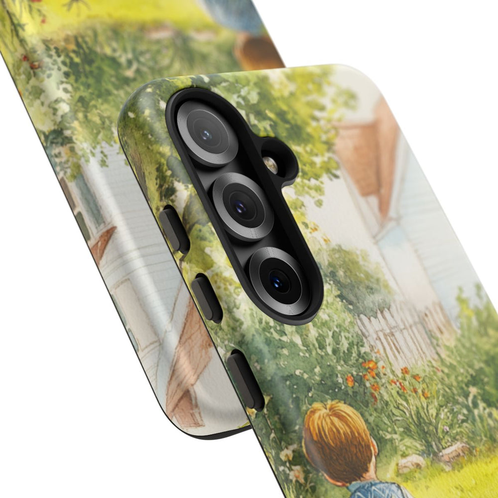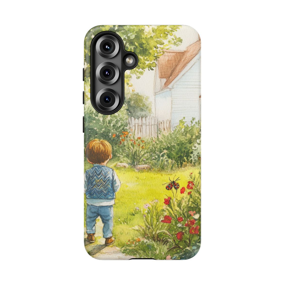 Deze illustratie toont een kind dat in een levendige tuin vol kleurrijke bloemen staat. Het kind draagt een vest met een patroon en wordt omringd door weelderig groen, met op de achtergrond een sfeervol huis. De scène straalt een rustige buitensfeer uit en benadrukt de schoonheid van de natuur. Het hoesje is gemaakt van stevige materialen en biedt optimale bescherming voor je toestel, terwijl het deze vrolijke afbeelding laat zien.