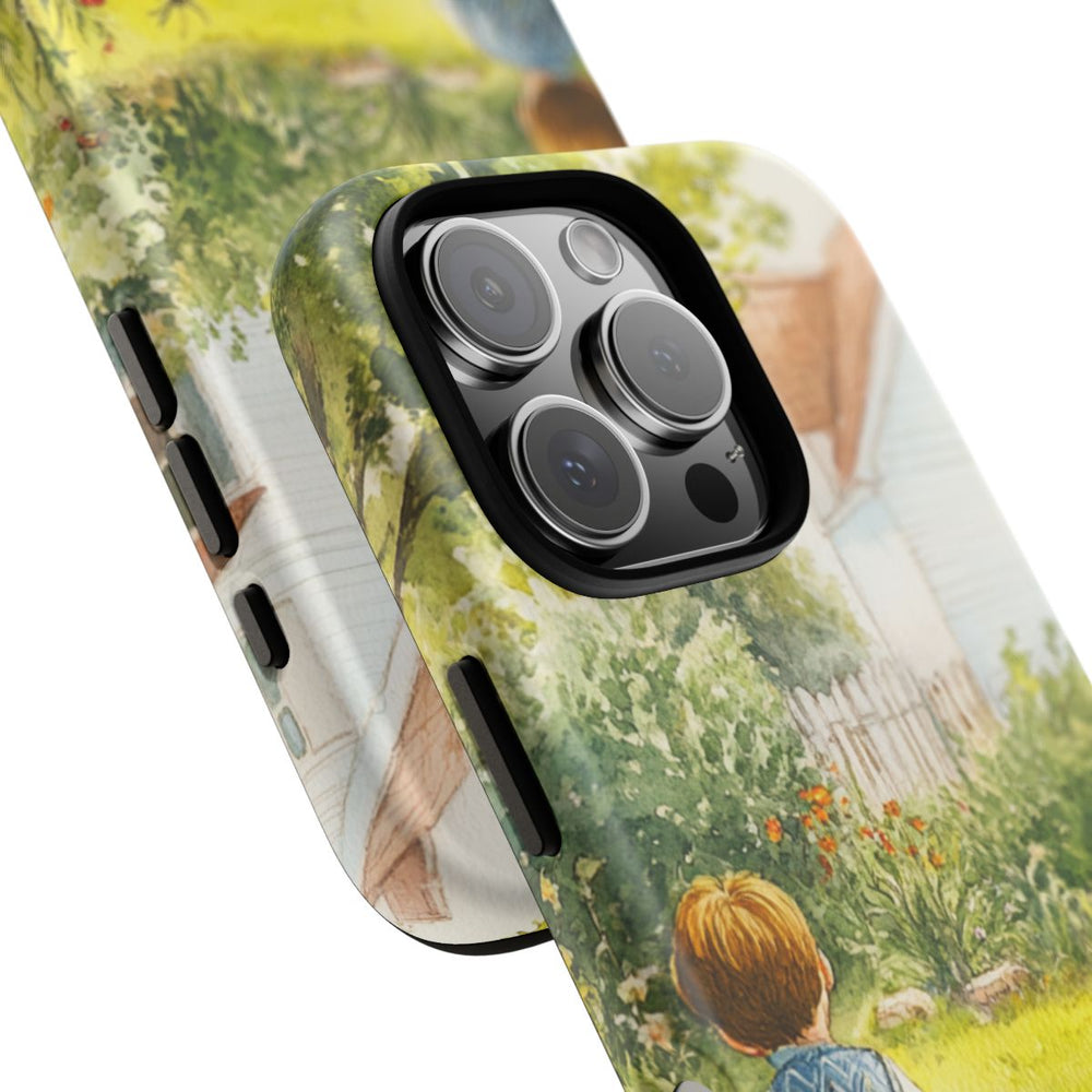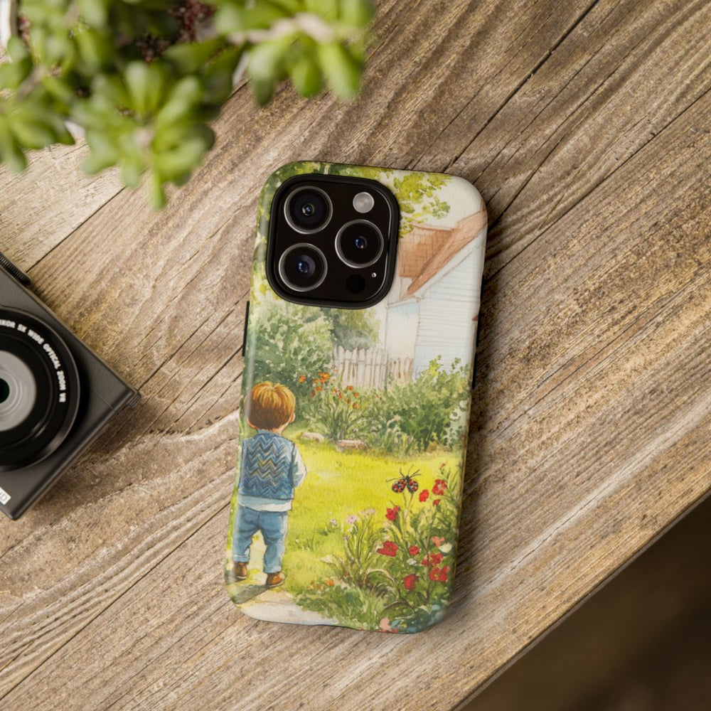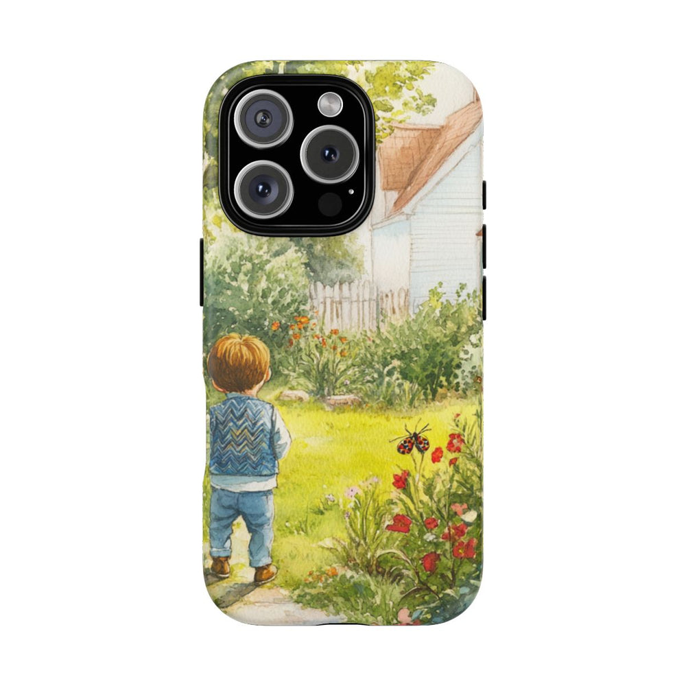 Deze illustratie toont een jong kind in een levendige tuin, omringd door kleurrijke bloemen en groen. Het kind draagt een stijlvolle blauwe bodywarmer en kijkt naar een sfeervol huis op de achtergrond. De scène straalt rust uit en een vriendelijke lieveheersbeestje zorgt voor een speels accent. Het hoesje is gemaakt van stevige materialen en ondersteunt draadloos opladen, waardoor het een praktische keuze is voor dagelijks gebruik.