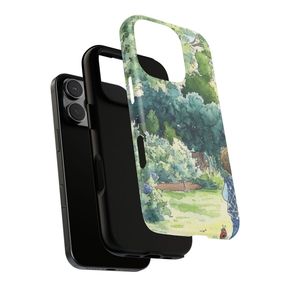 Deze illustratie toont een kind dat in een weelderige tuin staat, omringd door hoge bomen en levendig groen. Het kind draagt een stijlvolle blauwe bodywarmer en kijkt van achteren naar de rustige achtertuin. Op de grond is een vriendelijke lieveheersbeestje te zien, wat een speels accent aan het tafereel geeft. De afbeelding is uitgevoerd in traditionele aquarelstijl en brengt de schoonheid van de natuur prachtig in beeld. Dit ontwerp is gedrukt op een stevig mat hoesje, ideaal om je toestel te beschermen.