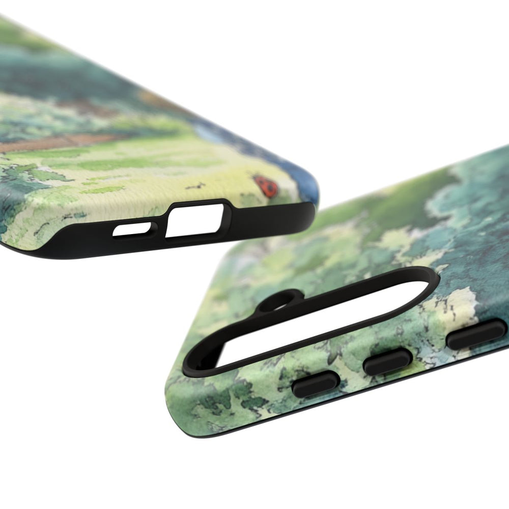 Dit hoesje is versierd met een sfeervolle aquarelillustratie van een kind dat in een weelderige tuin staat. Het kind, van achteren gezien en gekleed in een stijlvolle blauwe bodywarmer, wordt omringd door hoge bomen en levendig groen. Op de grond is een schattig lieveheersbeestje te zien, wat het tafereel een speelse uitstraling geeft. Het hoesje is gemaakt van stevige materialen en ondersteunt draadloos opladen, waardoor het een praktische keuze is voor dagelijks gebruik.