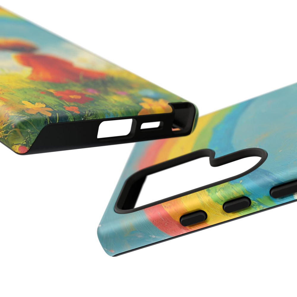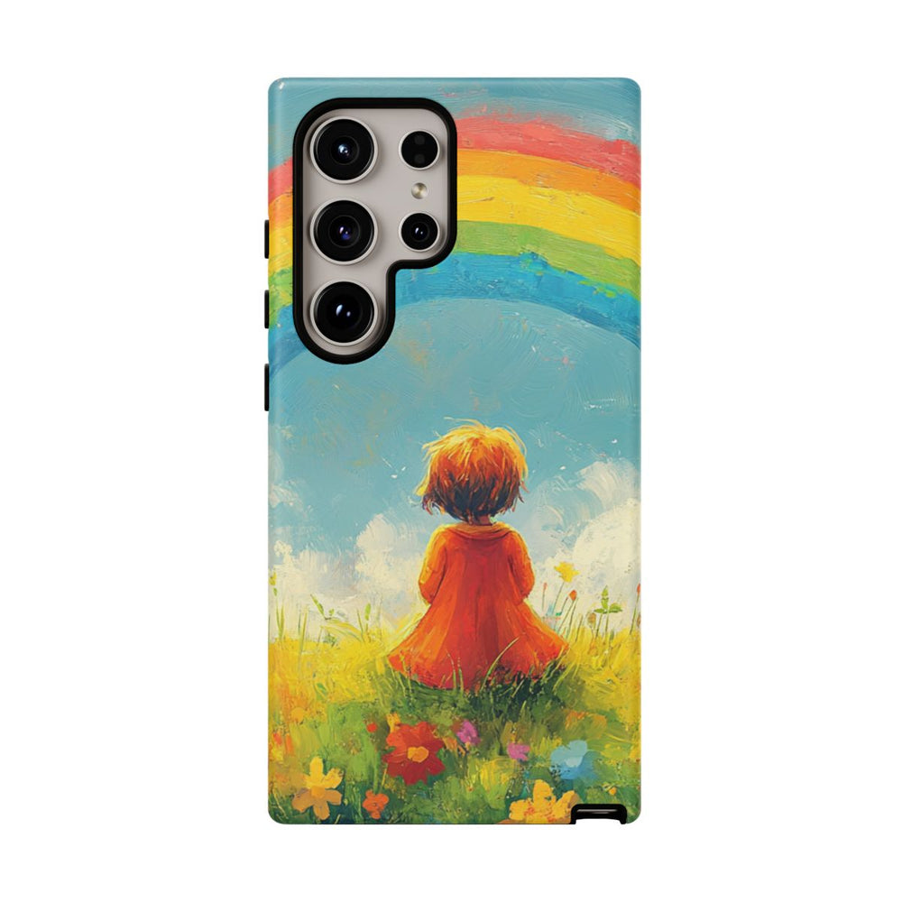 Dit hoesje toont een kind dat in een levendig veld vol kleurrijke bloemen zit en omhoog kijkt naar een heldere regenboog die zich uitstrekt over een blauwe lucht. De scène is geschilderd in een speelse stijl, waarbij zachte wolken de regenboog omlijsten. De felle kleuren zorgen voor een vrolijke en optimistische uitstraling, waardoor dit ontwerp perfect is voor een telefoonhoesje. Het hoesje bestaat uit een dubbele laag voor extra bescherming en is geschikt voor draadloos opladen.