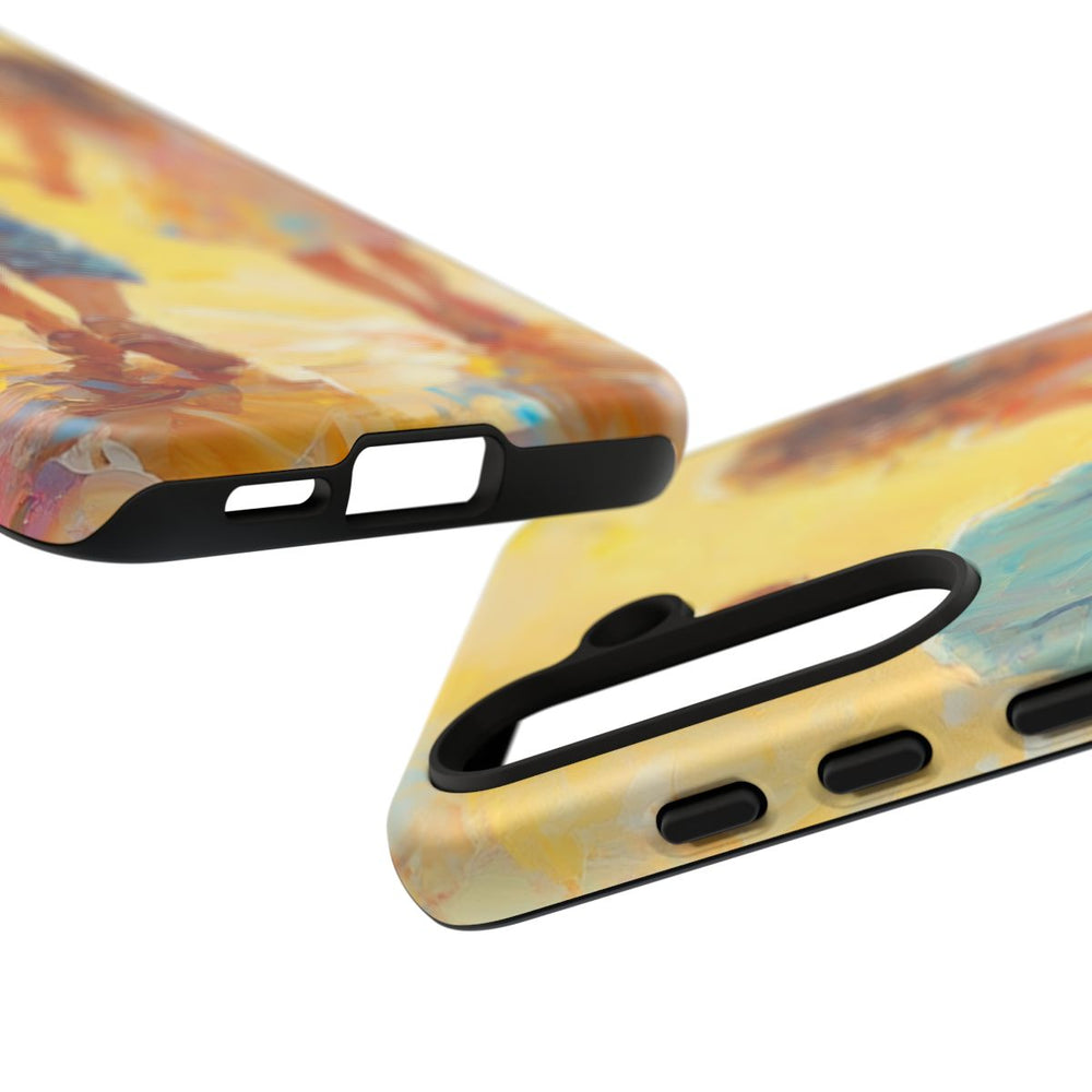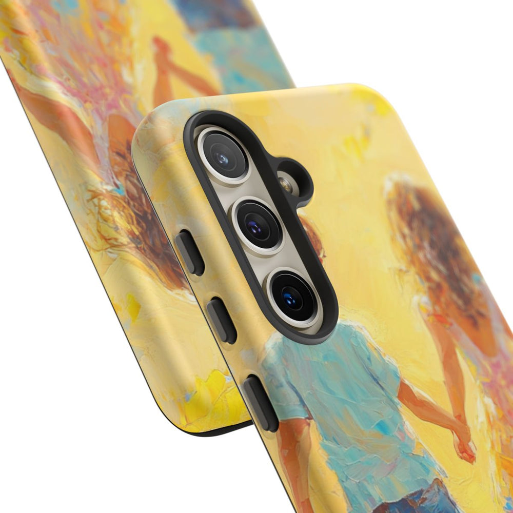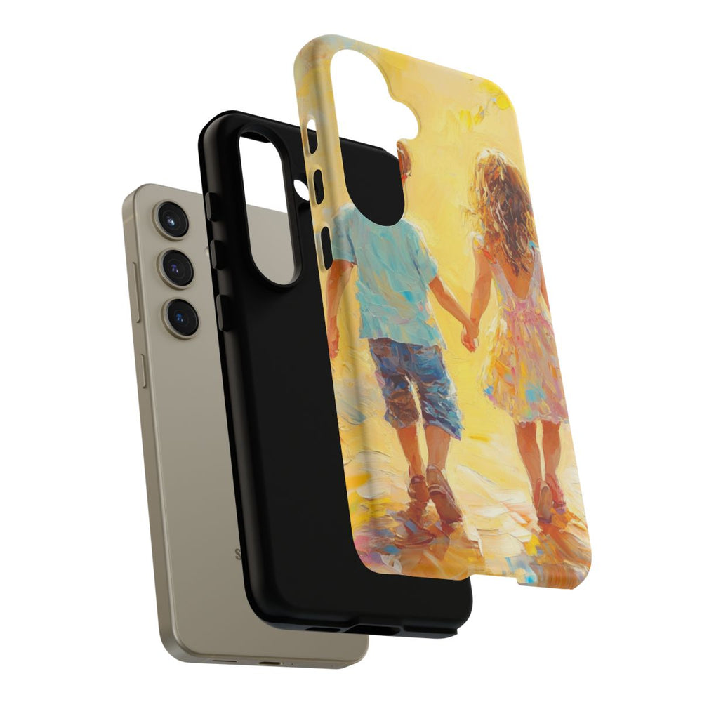 Dit hoesje toont twee jonge kinderen die hand in hand lopen, gezien van achteren. Het kind links draagt een lichtblauw shirt en blauwe korte broek, terwijl het kind rechts een kleurrijk jurkje aan heeft met tinten geel, roze en blauw. De achtergrond bestaat uit een abstracte mix van warme gele en oranje tinten, gecombineerd met koele blauwen, wat zorgt voor een levendige en heldere uitstraling. Het hoesje heeft een dubbele laag met een matte afwerking en is gemaakt van polycarbonaat en TPU. Ontworpen voor extra stevigheid en geschikt voor draadloos opladen.