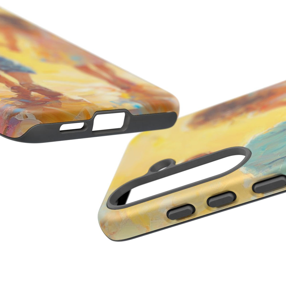 Dit telefoonhoesje toont een kleurrijke, impressionistische afbeelding van twee kinderen die elkaars hand vasthouden. Het kind links draagt een lichtblauw shirt met een blauwe korte broek, terwijl het kind rechts een lichtgekleurde jurk met roze en gele accenten draagt. De achtergrond bestaat uit warme, heldere kleuren zoals geel, oranje en blauw, wat zorgt voor een stralende en vrolijke sfeer. Het hoesje heeft een dubbele laag met een matte afwerking voor extra bescherming en is geschikt voor draadloos opladen.