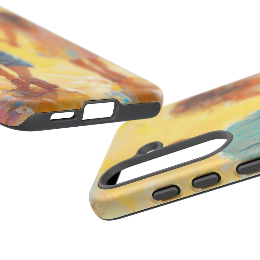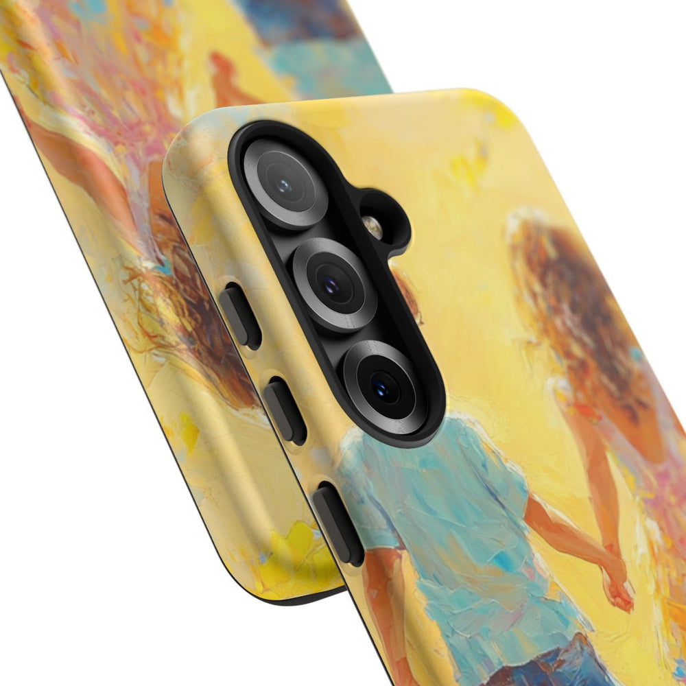 Dit hoesje is voorzien van een schilderachtig ontwerp waarop twee kinderen hand in hand wegwandelen. Het kind links draagt een lichtblauw shirt en een spijkerbroek, terwijl het kind rechts een kleurrijke jurk aan heeft. De achtergrond bestaat uit een mix van warme gele en oranje tinten, gecombineerd met koele blauwtinten, wat zorgt voor een heldere en levendige uitstraling. Het matte, stevige hoesje is gemaakt van polycarbonaat en TPU en is ontworpen voor duurzaamheid en bescherming, ideaal voor gebruik buitenshuis. Geschikt voor de Galaxy S25.