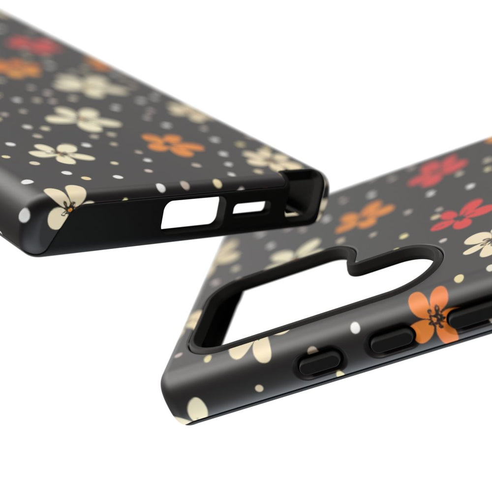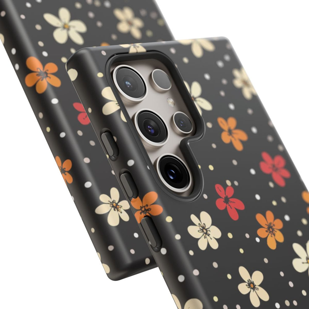 Dit hoesje heeft een herhalend patroon van kleine bloemen in crème-, oranje- en roodtinten, verspreid over een zwarte achtergrond. De bloemen hebben eenvoudige blaadjes en gedetailleerde hartjes. Tussen de bloemen zijn kleine stippen in lichte kleuren te zien, wat het ontwerp een speelse uitstraling geeft. Het matte hoesje bestaat uit een stevige dubbele laag met een polycarbonaat buitenkant en een TPU-binnenzijde, waardoor het duurzaam is en goede bescherming biedt. Geschikt voor draadloos opladen.