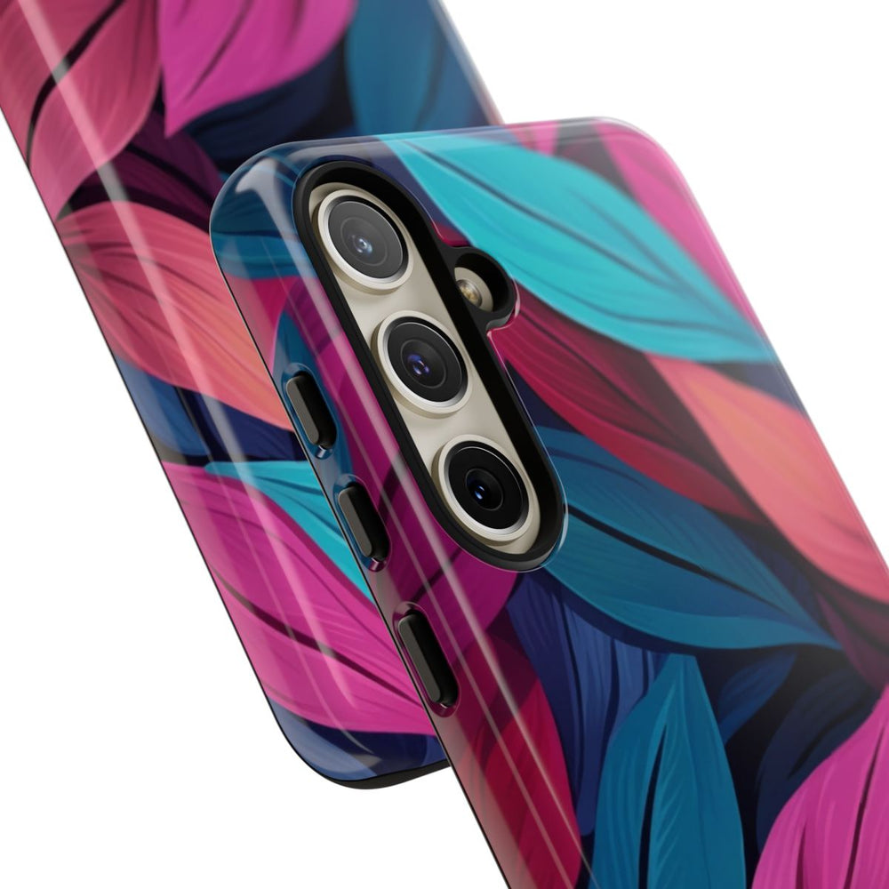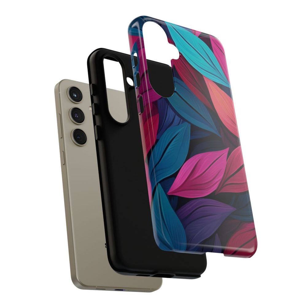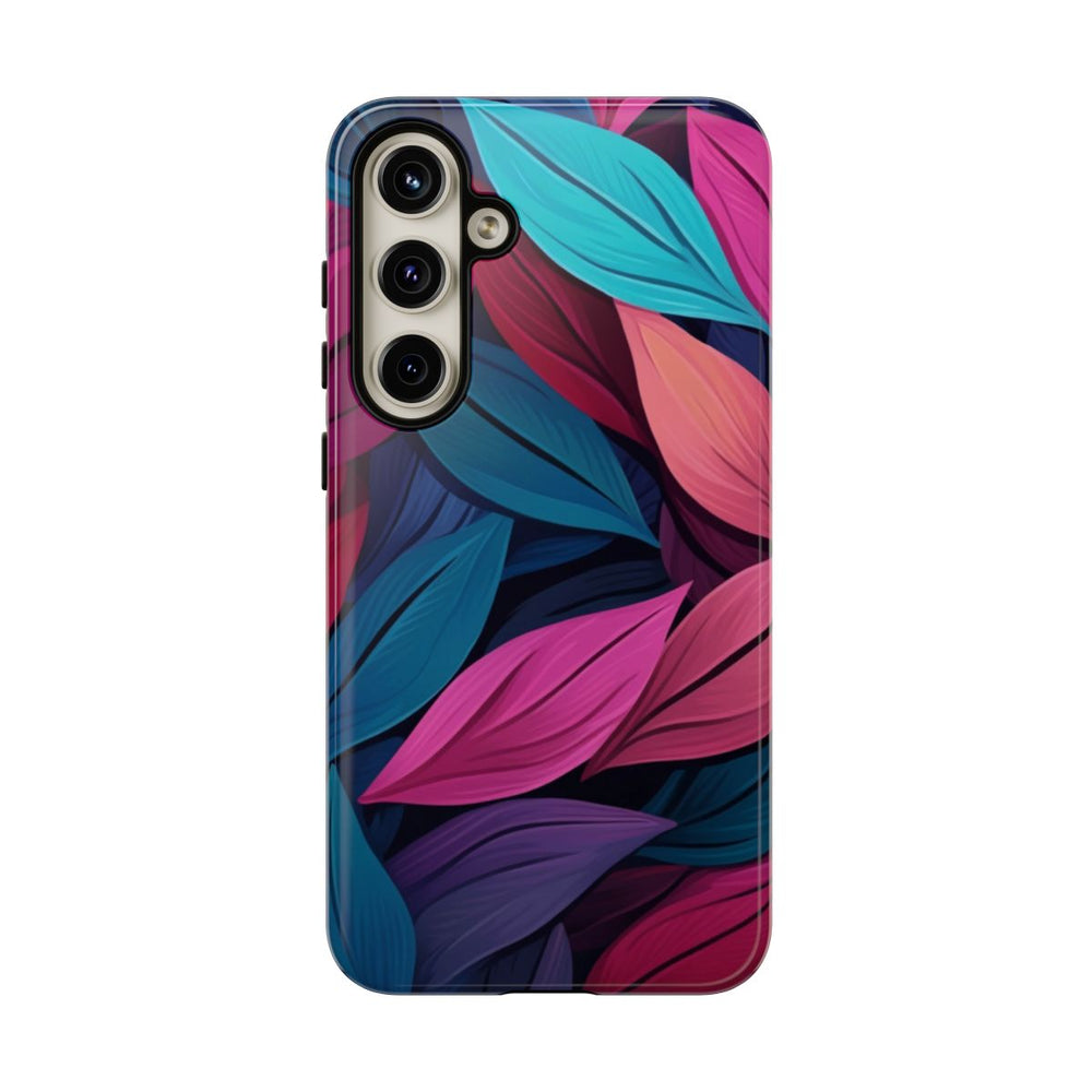 Dit ontwerp toont een abstract patroon van overlappende bladeren in levendige, effen kleuren. De bladeren zijn uitgevoerd in tinten teal, magenta, roze, paars en blauw, wat zorgt voor een rijke en kleurrijke uitstraling. Het beeld heeft geen schaduwen, waardoor de platte, krachtige kleuren extra opvallen. Het patroon is gedrukt op een glanzend, stevig hoesje met een dubbele laag van polycarbonaat en TPU, voor extra bescherming en ondersteuning van draadloos opladen. Het ontwerp oogt modern en opvallend.