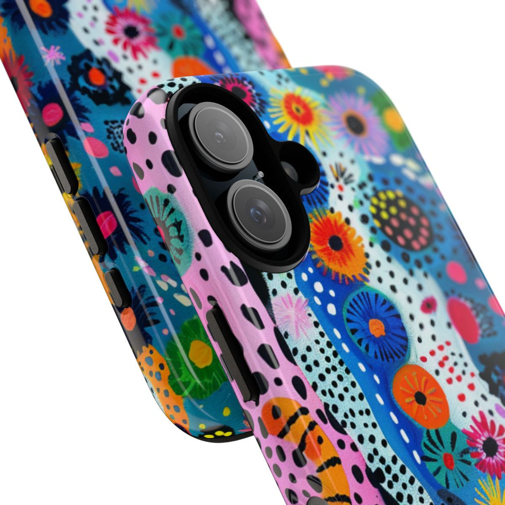 Dit telefoonhoesje heeft een opvallend en levendig abstract patroon met een mix van kleurrijke bloemen en organische vormen. Heldere tinten oranje, roze, blauw, geel en groen zorgen voor een energieke uitstraling. Zwarte stippen en strepen geven het ontwerp extra contrast en textuur. Het patroon bevat een speels element dat doet denken aan een gestreepte dierenstaart. De afbeelding is gedrukt op een glanzend, stevig hoesje van polycarbonaat en TPU, dat bestaat uit twee beschermende lagen en geschikt is voor draadloos opladen.