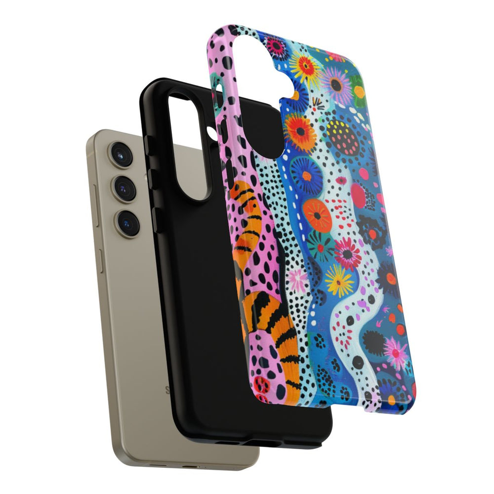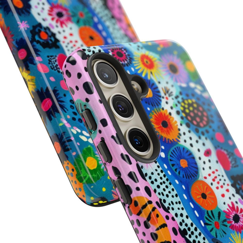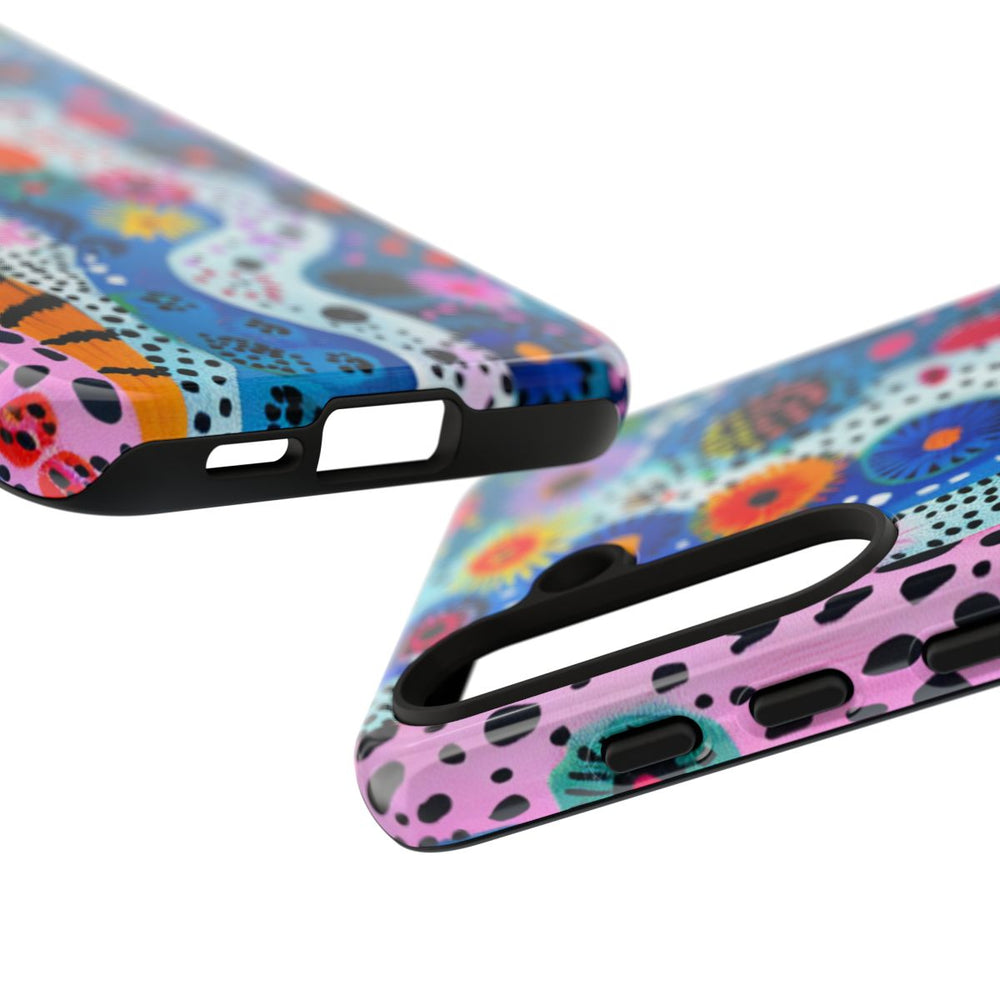 Dit telefoonhoesje heeft een opvallend en levendig abstract patroon met een mix van kleurrijke bloemen en organische vormen. Heldere tinten oranje, roze, blauw, geel en groen zorgen voor een energieke uitstraling. Zwarte stippen en strepen geven het ontwerp extra contrast en textuur. Het patroon bevat een speels element dat doet denken aan een gestreepte dierenstaart. De afbeelding is gedrukt op een glanzend, stevig hoesje van polycarbonaat en TPU, dat bestaat uit twee beschermende lagen en geschikt is voor draadloos opladen.