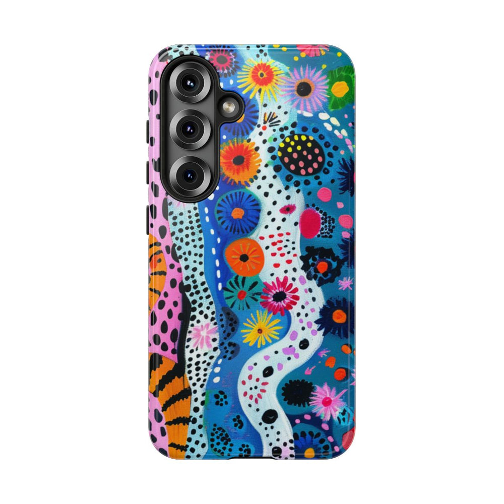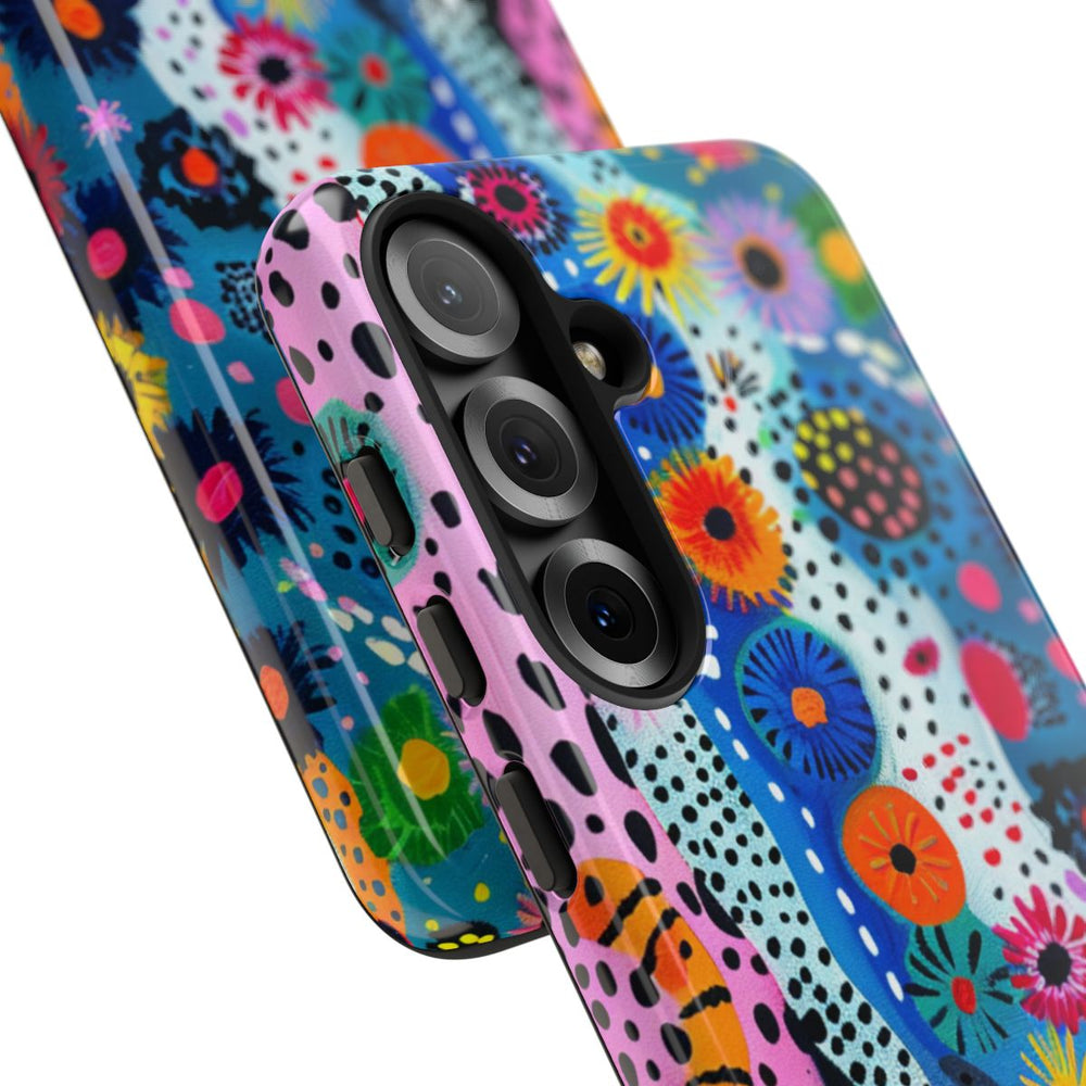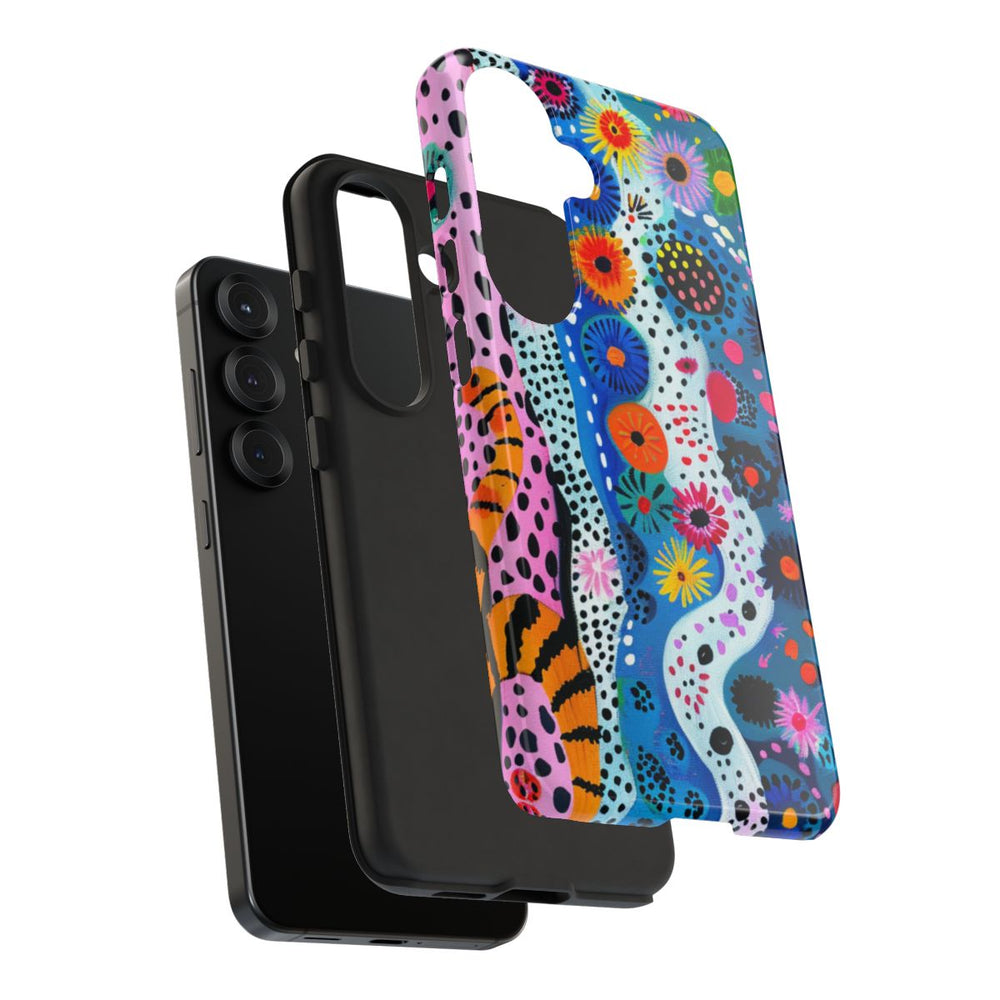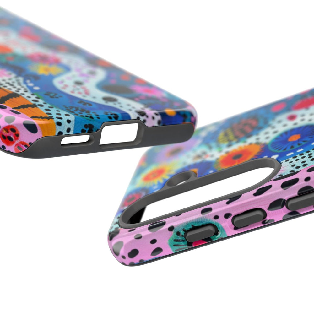 Dit telefoonhoesje heeft een opvallend en levendig abstract patroon met een mix van kleurrijke bloemen en organische vormen. Heldere tinten oranje, roze, blauw, geel en groen zorgen voor een energieke uitstraling. Zwarte stippen en strepen geven het ontwerp extra contrast en textuur. Het patroon bevat een speels element dat doet denken aan een gestreepte dierenstaart. De afbeelding is gedrukt op een glanzend, stevig hoesje van polycarbonaat en TPU, dat bestaat uit twee beschermende lagen en geschikt is voor draadloos opladen.