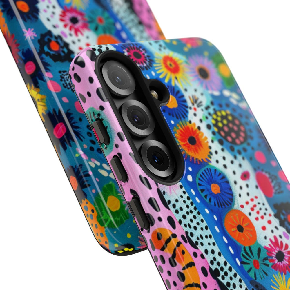 Dit telefoonhoesje heeft een opvallend en levendig abstract patroon met een mix van kleurrijke bloemen en organische vormen. Heldere tinten oranje, roze, blauw, geel en groen zorgen voor een energieke uitstraling. Zwarte stippen en strepen geven het ontwerp extra contrast en textuur. Het patroon bevat een speels element dat doet denken aan een gestreepte dierenstaart. De afbeelding is gedrukt op een glanzend, stevig hoesje van polycarbonaat en TPU, dat bestaat uit twee beschermende lagen en geschikt is voor draadloos opladen.