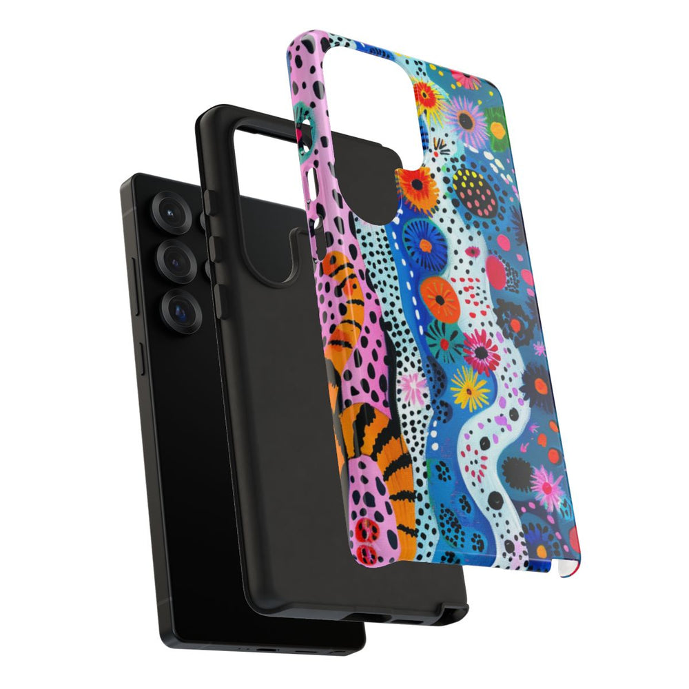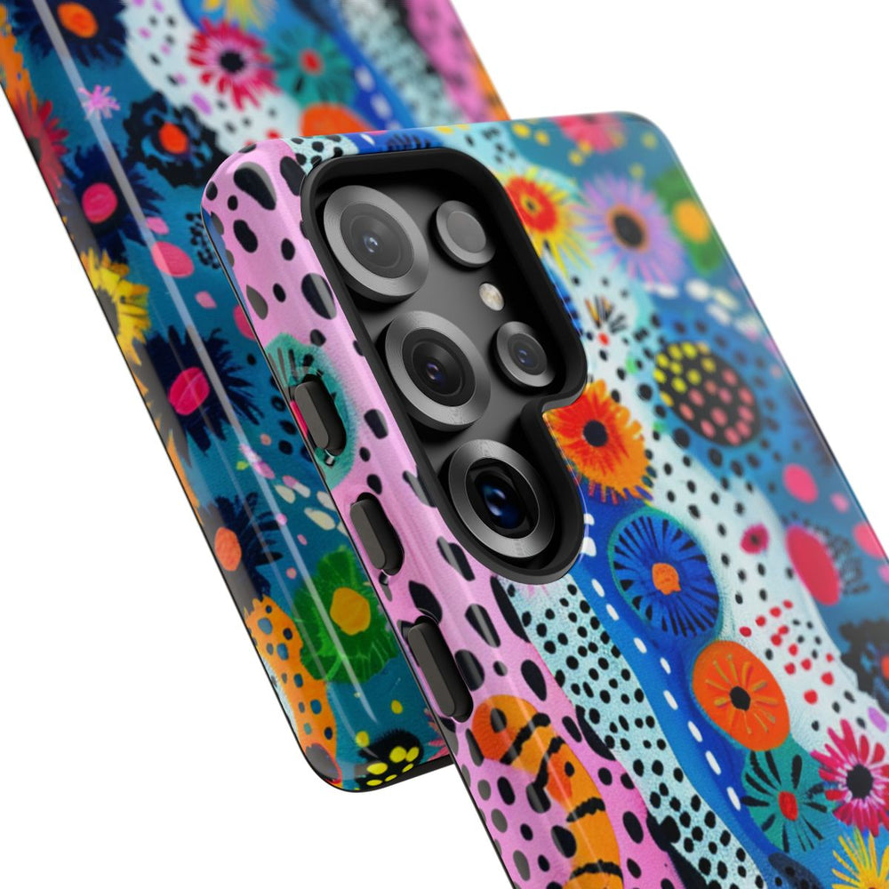 Dit telefoonhoesje heeft een opvallend en levendig abstract patroon met een mix van kleurrijke bloemen en organische vormen. Heldere tinten oranje, roze, blauw, geel en groen zorgen voor een energieke uitstraling. Zwarte stippen en strepen geven het ontwerp extra contrast en textuur. Het patroon bevat een speels element dat doet denken aan een gestreepte dierenstaart. De afbeelding is gedrukt op een glanzend, stevig hoesje van polycarbonaat en TPU, dat bestaat uit twee beschermende lagen en geschikt is voor draadloos opladen.