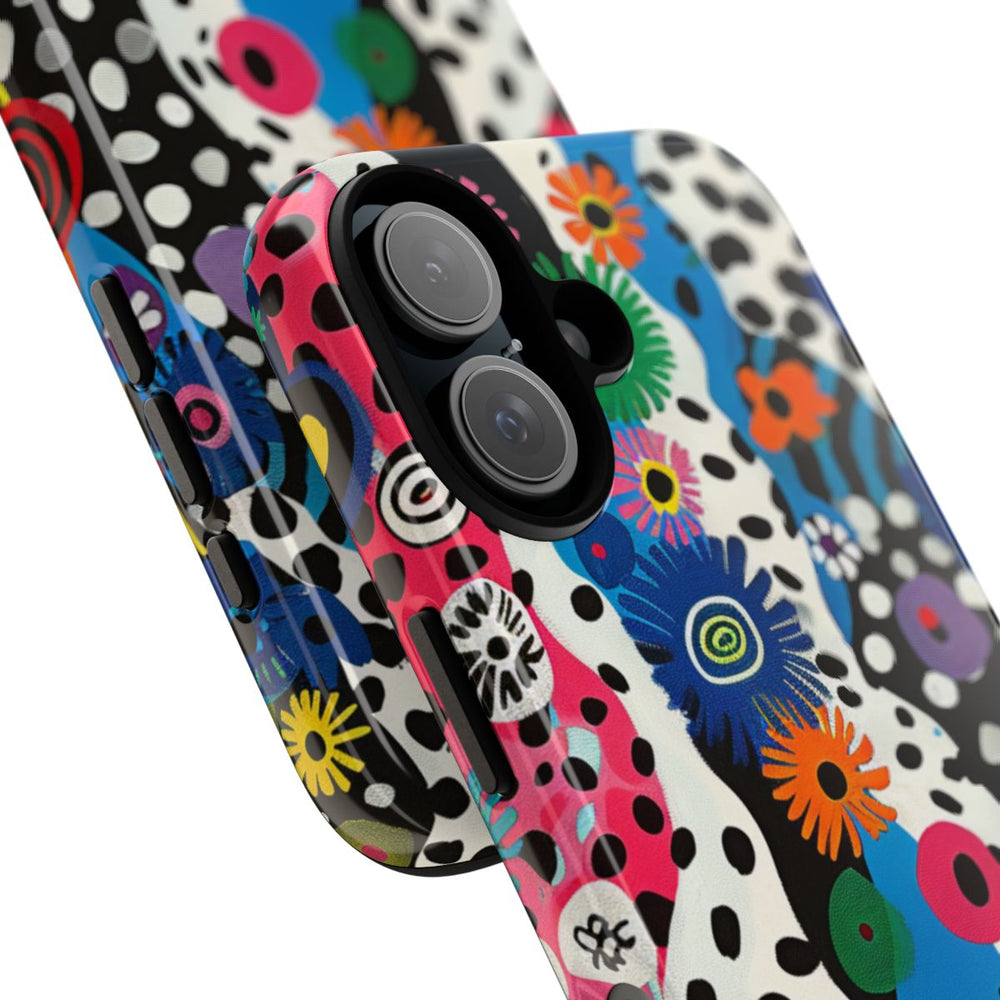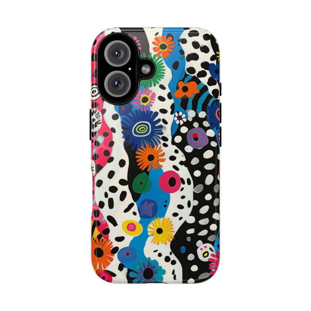 Dit telefoonhoesje heeft een abstract patroon met golvende zebra-achtige strepen in zwart, wit, blauw, roze en geel. Over het ontwerp zijn heldere bloemen in oranje, geel, groen, blauw, roze en paars verspreid, wat zorgt voor een levendige en dynamische uitstraling. De illustratie heeft een speelse, artistieke stijl met opvallende vormen en felle kleuren. Het hoesje is glanzend en stevig dankzij de dubbele laag van een polycarbonaat buitenkant en een TPU binnenzijde. Dit biedt extra bescherming en is geschikt voor draadloos opladen.
