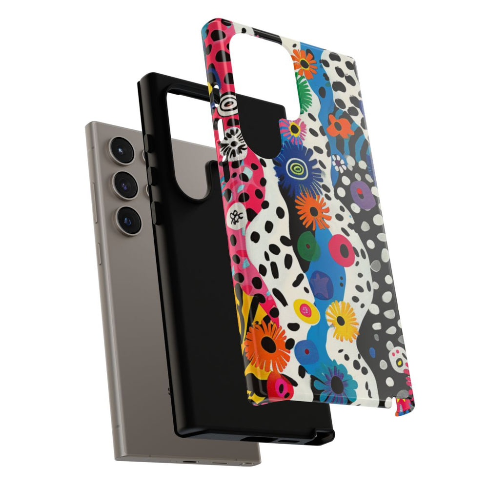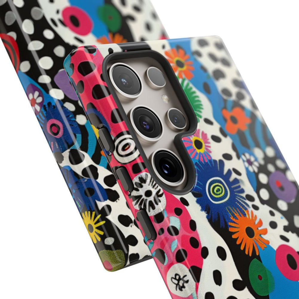 Dit telefoonhoesje heeft een abstract patroon met golvende zebra-achtige strepen in zwart, wit, blauw, roze en geel. Over het ontwerp zijn heldere bloemen in oranje, geel, groen, blauw, roze en paars verspreid, wat zorgt voor een levendige en dynamische uitstraling. De illustratie heeft een speelse, artistieke stijl met opvallende vormen en felle kleuren. Het hoesje is glanzend en stevig dankzij de dubbele laag van een polycarbonaat buitenkant en een TPU binnenzijde. Dit biedt extra bescherming en is geschikt voor draadloos opladen.