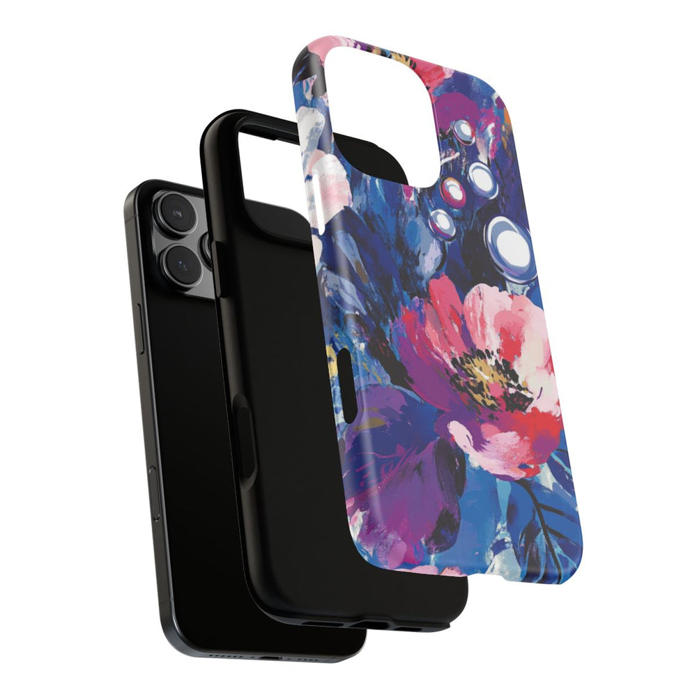 Dit hoesje heeft een levendig abstract bloemenpatroon met grote bloemen in tinten roze, wit en rood, op een diepe blauwe en paarse achtergrond. De parelachtige bolletjes geven het ontwerp een glanzend en ruimtelijk effect. Dankzij de dubbele laag van een polycarbonaat buitenkant en TPU-binnenzijde biedt het hoesje extra bescherming en ondersteunt het draadloos opladen.