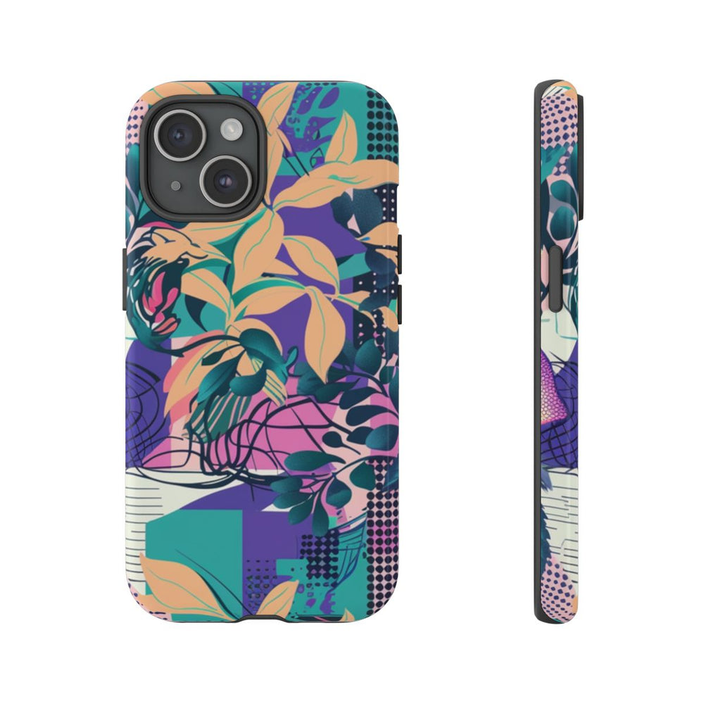 Dit ontwerp heeft een levendig en kleurrijk abstract bloemenpatroon met grote, gedetailleerde bloemen in paarse, roze en blauwe tinten. Op de achtergrond zijn geometrische vormen, rasters en gestippelde patronen te zien in teal, geel en perzikkleurige accenten. Verschillende bladvormen in groen en perzik zorgen voor diepte en contrast in het geheel. Het patroon is opvallend en dynamisch, ideaal voor een glanzend en stevig hoesje van duurzaam polycarbonaat en TPU. Het hoesje biedt goede bescherming en is geschikt voor draadloos opladen.