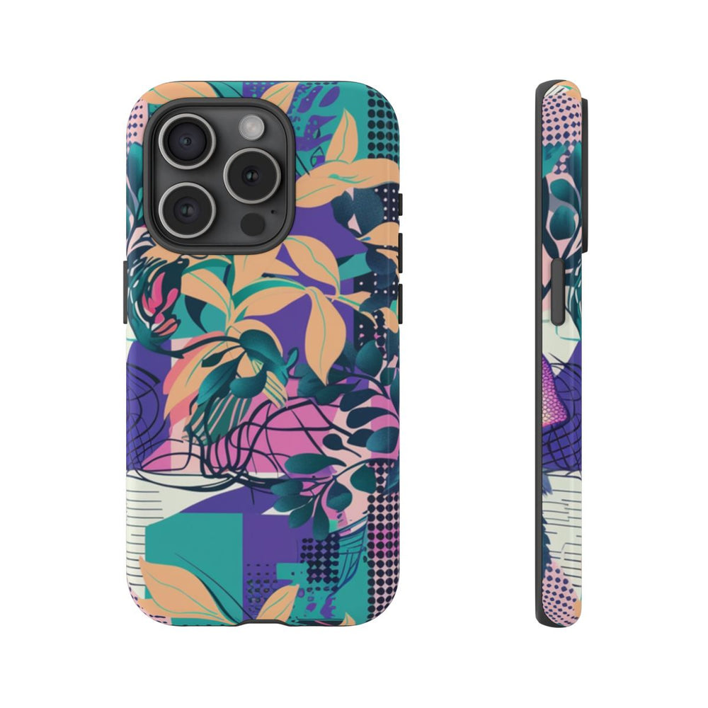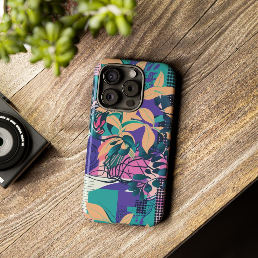 Dit ontwerp heeft een levendig en kleurrijk abstract bloemenpatroon met grote, gedetailleerde bloemen in paarse, roze en blauwe tinten. Op de achtergrond zijn geometrische vormen, rasters en gestippelde patronen te zien in teal, geel en perzikkleurige accenten. Verschillende bladvormen in groen en perzik zorgen voor diepte en contrast in het geheel. Het patroon is opvallend en dynamisch, ideaal voor een glanzend en stevig hoesje van duurzaam polycarbonaat en TPU. Het hoesje biedt goede bescherming en is geschikt voor draadloos opladen.