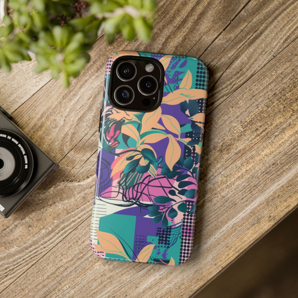 Dit ontwerp heeft een levendig en kleurrijk abstract bloemenpatroon met grote, gedetailleerde bloemen in paarse, roze en blauwe tinten. Op de achtergrond zijn geometrische vormen, rasters en gestippelde patronen te zien in teal, geel en perzikkleurige accenten. Verschillende bladvormen in groen en perzik zorgen voor diepte en contrast in het geheel. Het patroon is opvallend en dynamisch, ideaal voor een glanzend en stevig hoesje van duurzaam polycarbonaat en TPU. Het hoesje biedt goede bescherming en is geschikt voor draadloos opladen.