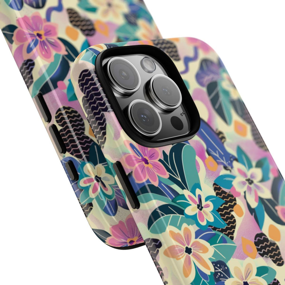 Dit telefoonhoesje heeft een levendig bloemenpatroon met diverse bloemen en bladeren in tinten blauw, roze, paars en crème. De achtergrond bestaat uit abstracte vormen en zachte pasteltinten, wat zorgt voor een speels en artistiek geheel. Het patroon loopt naadloos door over het hele hoesje. Dankzij de stevige dubbele laag van polycarbonaat en TPU biedt het hoesje optimale bescherming. Geschikt voor draadloos opladen.