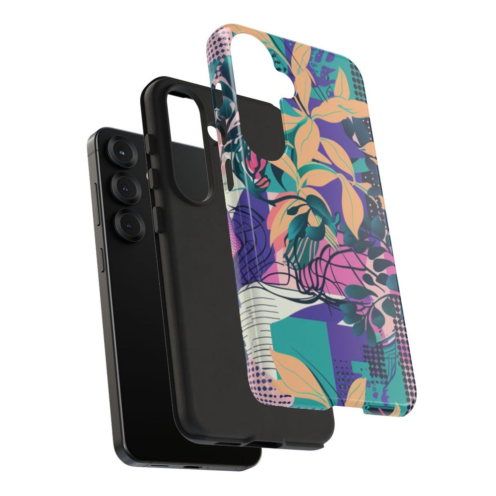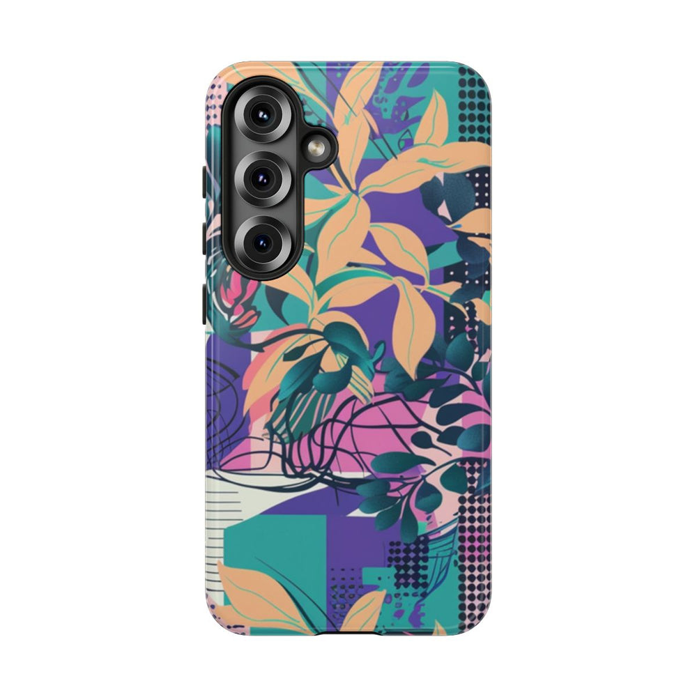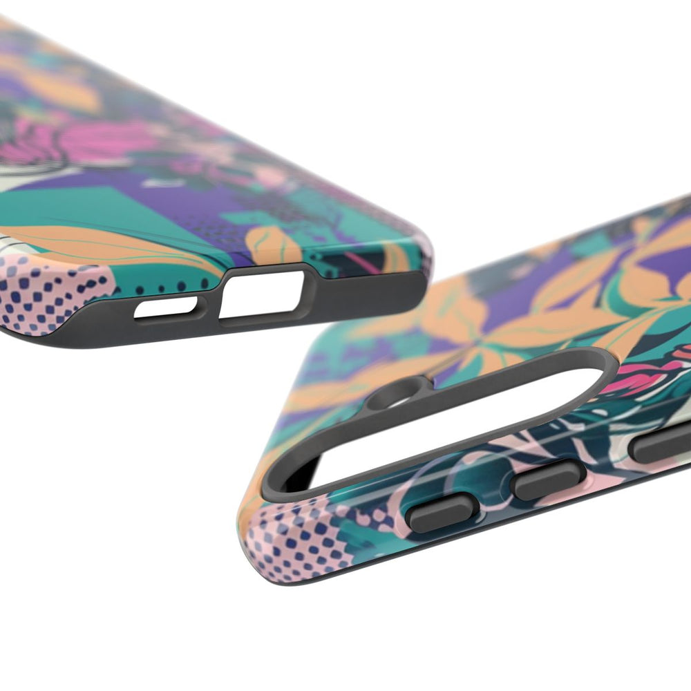 Dit ontwerp heeft een levendig en kleurrijk abstract bloemenpatroon met grote, gedetailleerde bloemen in paarse, roze en blauwe tinten. Op de achtergrond zijn geometrische vormen, rasters en gestippelde patronen te zien in teal, geel en perzikkleurige accenten. Verschillende bladvormen in groen en perzik zorgen voor diepte en contrast in het geheel. Het patroon is opvallend en dynamisch, ideaal voor een glanzend en stevig hoesje van duurzaam polycarbonaat en TPU. Het hoesje biedt goede bescherming en is geschikt voor draadloos opladen.