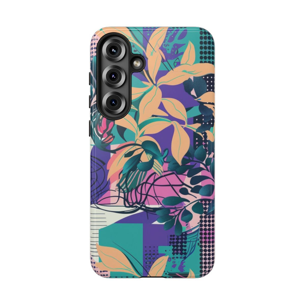 Dit ontwerp heeft een levendig en kleurrijk abstract bloemenpatroon met grote, gedetailleerde bloemen in paarse, roze en blauwe tinten. Op de achtergrond zijn geometrische vormen, rasters en gestippelde patronen te zien in teal, geel en perzikkleurige accenten. Verschillende bladvormen in groen en perzik zorgen voor diepte en contrast in het geheel. Het patroon is opvallend en dynamisch, ideaal voor een glanzend en stevig hoesje van duurzaam polycarbonaat en TPU. Het hoesje biedt goede bescherming en is geschikt voor draadloos opladen.