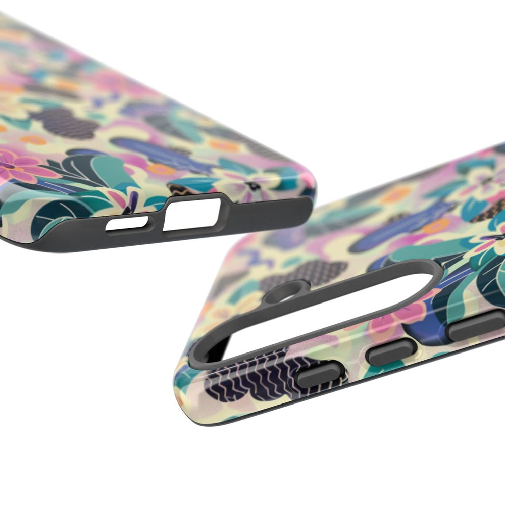 Dit telefoonhoesje heeft een levendig bloemenpatroon met diverse bloemen en bladeren in tinten blauw, roze, paars en crème. De achtergrond bestaat uit abstracte vormen en zachte pasteltinten, wat zorgt voor een speels en artistiek geheel. Het patroon loopt naadloos door over het hele hoesje. Dankzij de stevige dubbele laag van polycarbonaat en TPU biedt het hoesje optimale bescherming. Geschikt voor draadloos opladen.