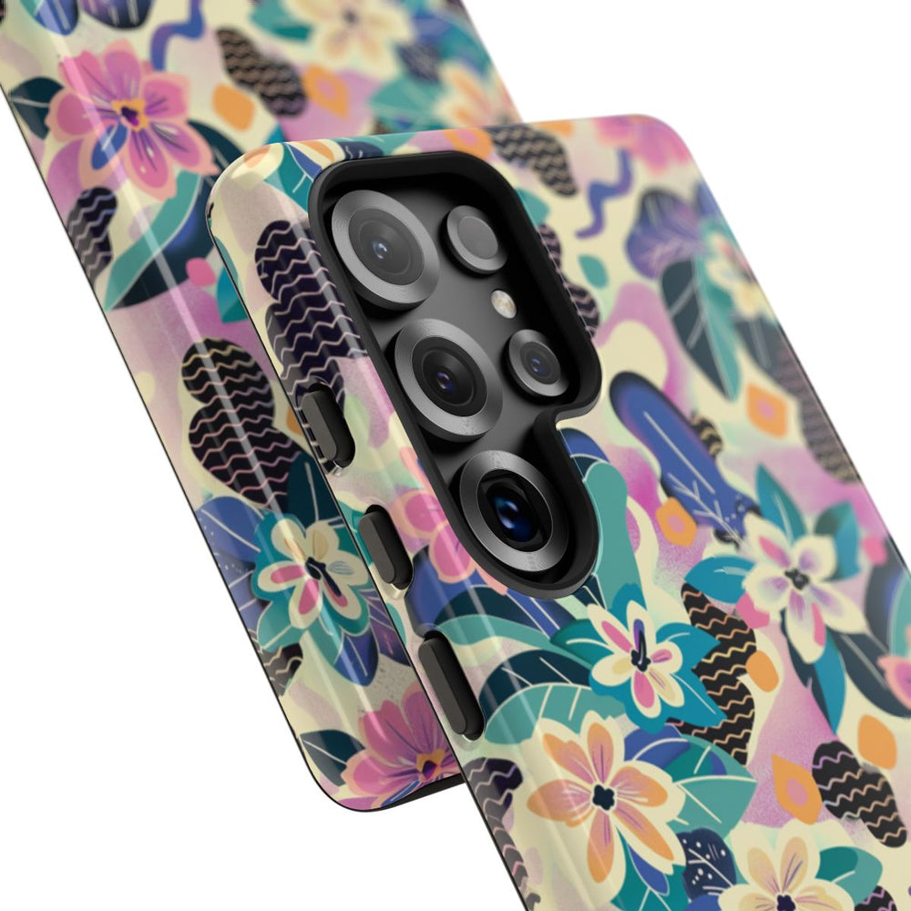 Dit telefoonhoesje heeft een levendig bloemenpatroon met diverse bloemen en bladeren in tinten blauw, roze, paars en crème. De achtergrond bestaat uit abstracte vormen en zachte pasteltinten, wat zorgt voor een speels en artistiek geheel. Het patroon loopt naadloos door over het hele hoesje. Dankzij de stevige dubbele laag van polycarbonaat en TPU biedt het hoesje optimale bescherming. Geschikt voor draadloos opladen.