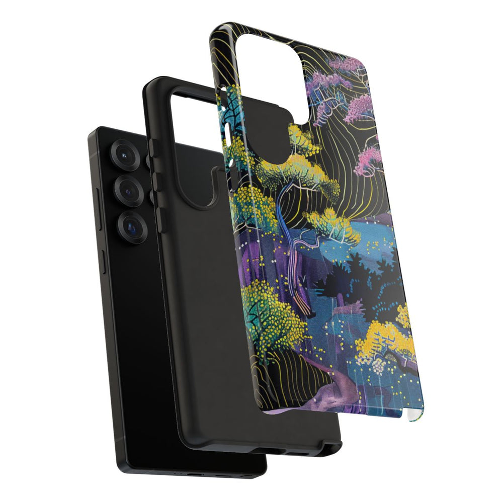 Dit hoesje heeft een abstract landschap met gestileerde bomen in levendige kleuren zoals geel, groen, blauw en paars. De bomen zijn voorzien van gedetailleerd bladerdek met stippenpatronen en gebogen stammen. De achtergrond is overwegend zwart en versierd met vloeiende gouden lijnen die een dynamisch, golvend effect creëren. Dit ontwerp combineert natuurlijke elementen met een eigentijdse artistieke stijl. Het hoesje heeft een glanzende afwerking, is extra stevig dankzij een dubbele laag en ondersteunt draadloos opladen.