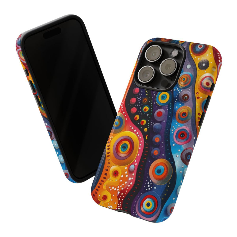 Dit hoesje is voorzien van een opvallend abstract patroon met talloze concentrische cirkels in verschillende formaten en kleuren. De cirkels zijn gerangschikt langs golvende banen die afwisselen in tinten blauw, geel, rood, paars en zwart. Kleine witte en gekleurde stippen zorgen voor extra accenten en geven het geheel een dynamische en levendige uitstraling. De afbeelding is gedrukt op een glanzend stevig hoesje met een polycarbonaat buitenkant en een TPU binnenzijde, wat zorgt voor dubbele bescherming en ondersteuning van draadloos opladen.