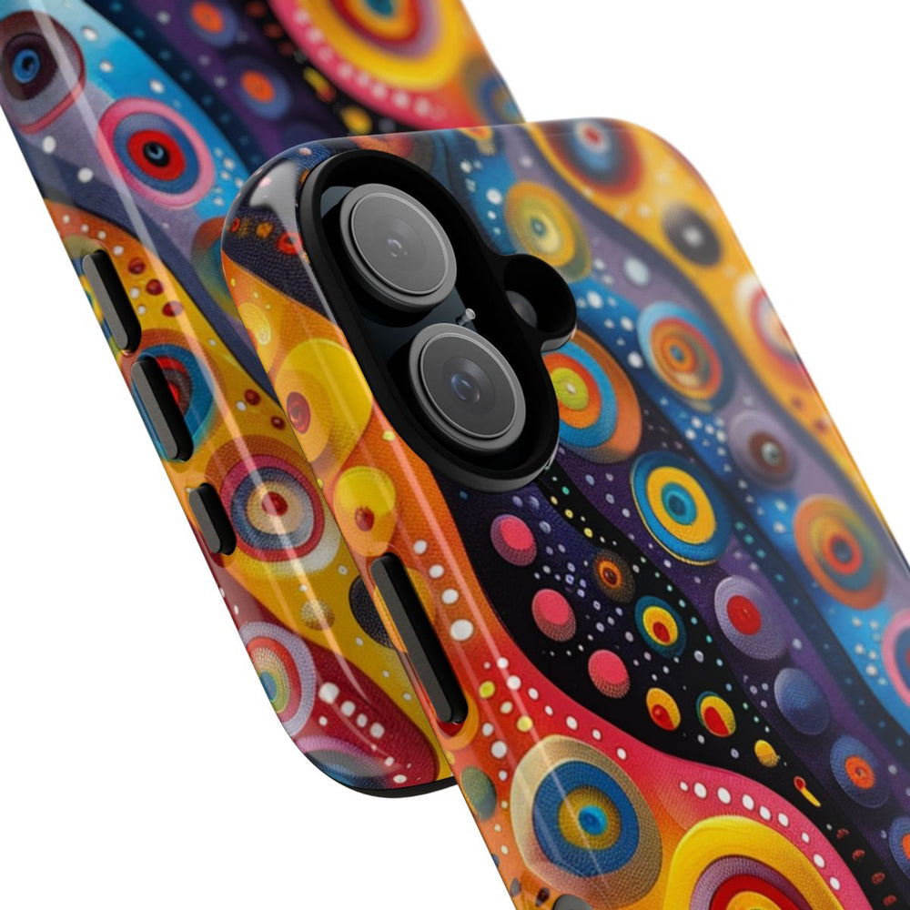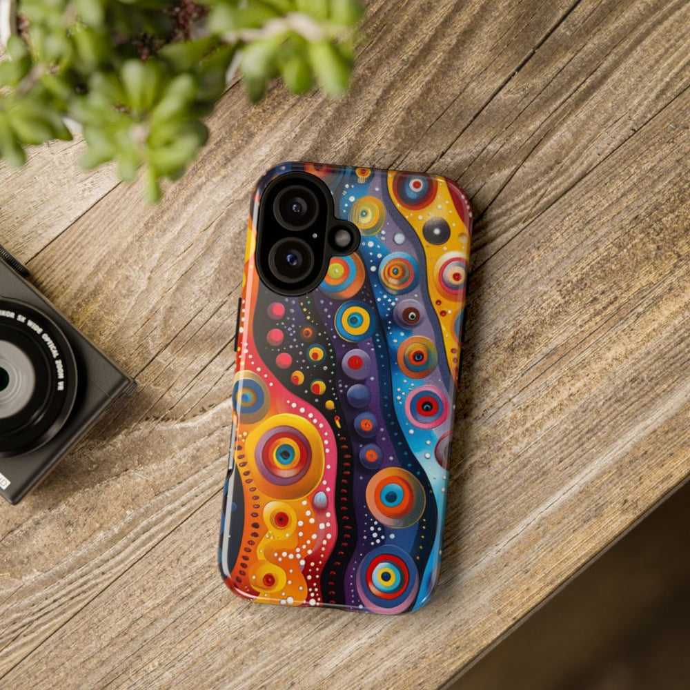 Dit hoesje is voorzien van een opvallend abstract patroon met talloze concentrische cirkels in verschillende formaten en kleuren. De cirkels zijn gerangschikt langs golvende banen die afwisselen in tinten blauw, geel, rood, paars en zwart. Kleine witte en gekleurde stippen zorgen voor extra accenten en geven het geheel een dynamische en levendige uitstraling. De afbeelding is gedrukt op een glanzend stevig hoesje met een polycarbonaat buitenkant en een TPU binnenzijde, wat zorgt voor dubbele bescherming en ondersteuning van draadloos opladen.