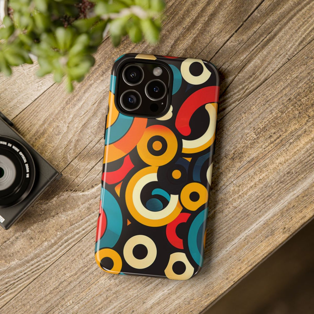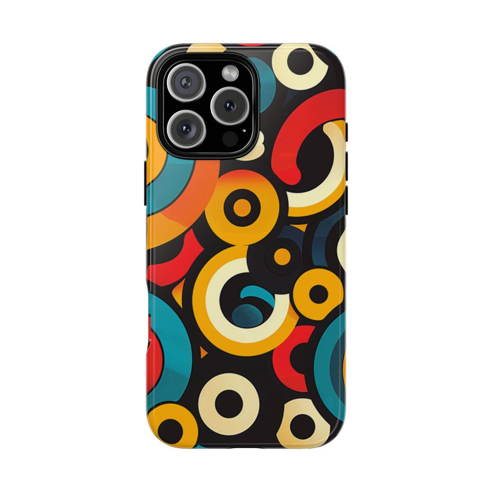 Dit telefoonhoesje heeft een abstract patroon van overlappende cirkels en bogen in levendige kleuren zoals teal, rood, geel, crème en zwart. De vormen verschillen in grootte en zorgen voor een dynamisch, gelaagd effect op een donkere achtergrond. Het ontwerp is modern en geometrisch, met vloeiende kleurverlopen en opvallende contrasten. Het hoesje is glanzend afgewerkt en bestaat uit een stevige dubbele laag van een polycarbonaat buitenkant en een TPU binnenzijde, waardoor het extra duurzaam is en optimale bescherming biedt. Het hoesje ondersteunt draadloos opladen en is bestand tegen invloeden van buitenaf.