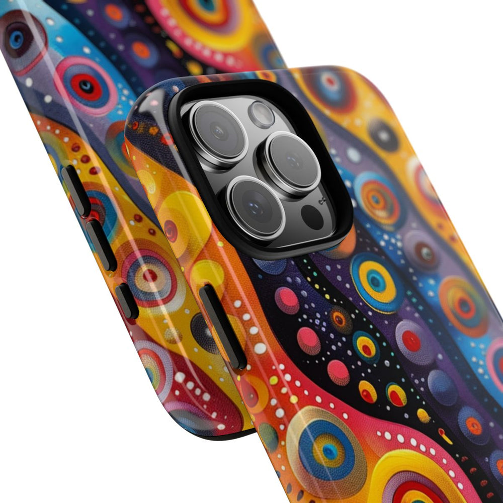 Dit hoesje is voorzien van een opvallend abstract patroon met talloze concentrische cirkels in verschillende formaten en kleuren. De cirkels zijn gerangschikt langs golvende banen die afwisselen in tinten blauw, geel, rood, paars en zwart. Kleine witte en gekleurde stippen zorgen voor extra accenten en geven het geheel een dynamische en levendige uitstraling. De afbeelding is gedrukt op een glanzend stevig hoesje met een polycarbonaat buitenkant en een TPU binnenzijde, wat zorgt voor dubbele bescherming en ondersteuning van draadloos opladen.